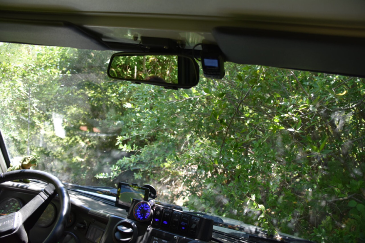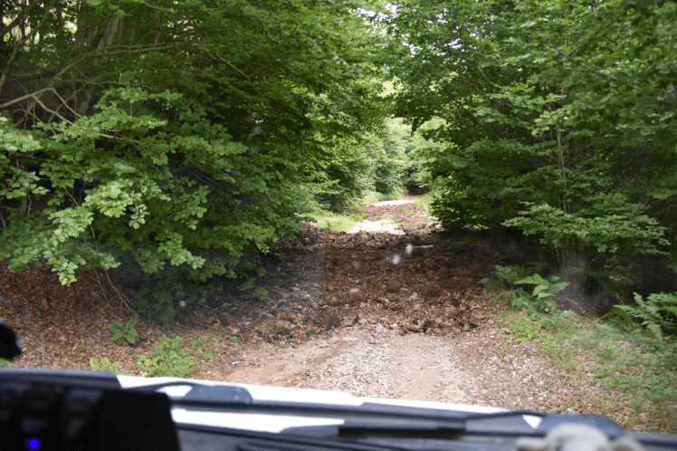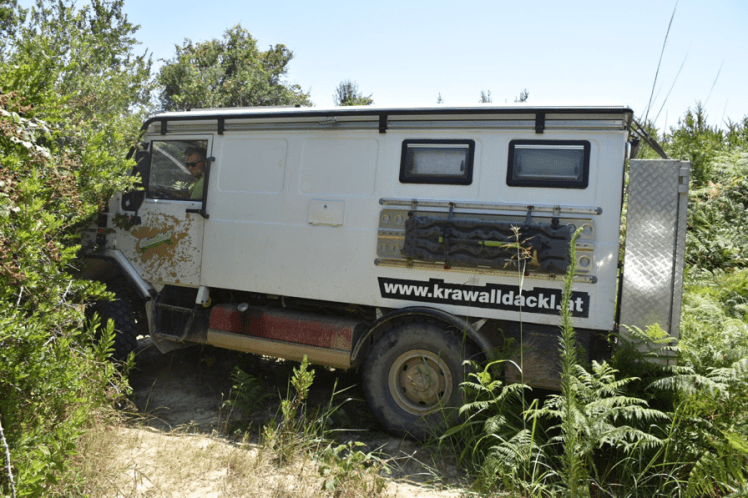 Wir kommen an Feldern und ein paar alten Punkern vorbei, dann wird der Weg teilweise ziemlich wild und eng zugewachsen. Aber wir kommen noch durch. An einer Weggabelung kommt uns plötzlich alles komisch vor. Wir müssten steil rechts hinauf abbiegen. Der Weg ist sehr ausgewaschen und schaut nicht befahrbar aus. Wir gehen mal schauen. Nicht weit oberhalb endet der „Weg“ an einem Ziegengatter. Hmmm. Also kein Durchkommen zum Strand. Ratlos schauen wir auf die Karte. Ja, es gibt schon noch Wegerl, die in der Nähe der Ziel-Koordinaten rauskommen. Umdrehen, anderen Weg probieren. Die Richtung ist vielversprechend, dann eine spitze Abzweigung nach links. Kaum mit dem Bremi zu schaffen und total dicht verwachsen. Aber ich bilde mir ein, Spuren gesehen zu haben. Diesmal sind wir nicht so schlau, vorher nachschauen zu gehen und stecken nach 200 Meter im Dickicht fest. Gefahren ist da schon laaaange niemand mehr. Sch…. Wie kommen wir da wieder raus? Zum Glück lichtet sich da dickicht bald und es gibt einen dicht mit Farn bewachsenen Platz. Da können wir umdrehen.