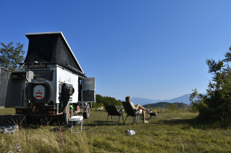 Nachdem wir in Burrel eingekauft und ein Bier getrunken haben machen wir uns auf den Weg zur nächsten Offroad Route. Diesmal aus dem Reiseführer der Pistenkuh. Die Route führt uns über die Berge von Klos nach Elbasan. Es ist später Nachmittag und der Plan (und die Hoffnung) ist, noch ein paar Kilometer zu fahren und dann den idealen Schlafplatz zu finden. Daraus wird vorerst mal nichts. Der Weg schraubt sich durch ein enges Tal langsam aber stetig nach oben. Immer ganz knapp am Abgrund entlang. Alle paar hundert Meter gekrönt durch Schrägfahrten, natürlich zum Abhang hin geneigt. Fahrfehler darf man sich da keinen erlauben. Höchste Konzentration ist gefordert. Aber der Dackl hat alles im Griff. Plötzlich mitten im Nichts ein kleines Dorf. Die wenigen Häuser schmiegen sich an den Berg. In einem Vorgarten wird gerade einem Schaf die Haut abgezogen. Schade, dass sie noch nicht weiter sind mit Schlachten, sonst hätten wir gefragt, ob wir ein paar Kotletts abbekommen können. Freundlich sind sie ja überall, die Leute.