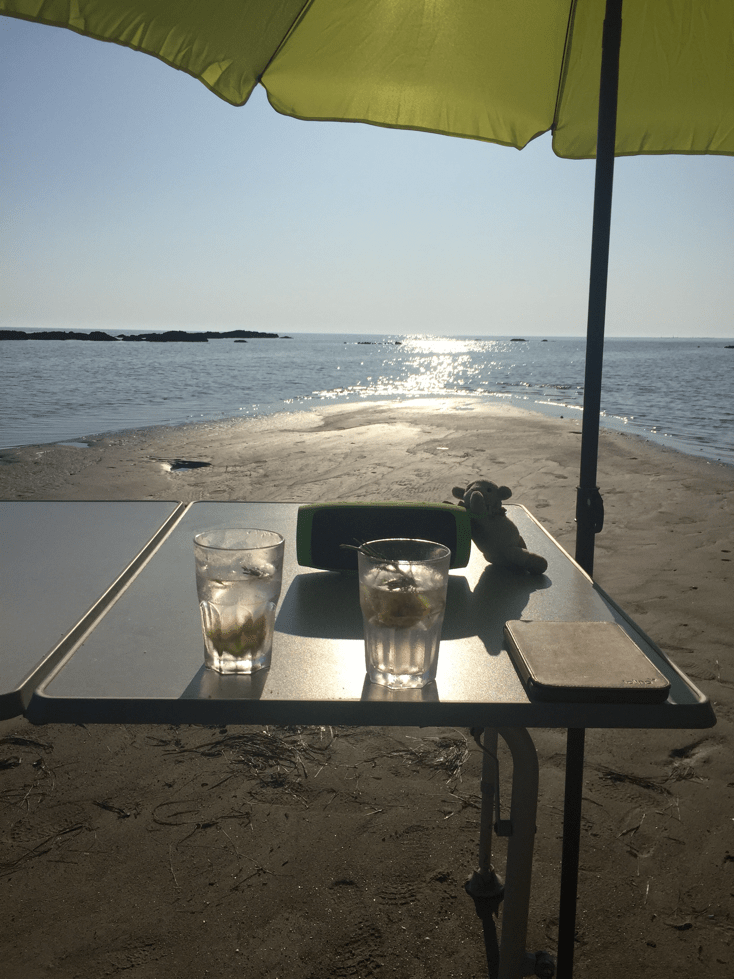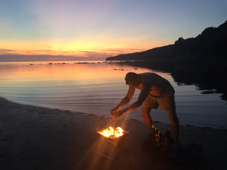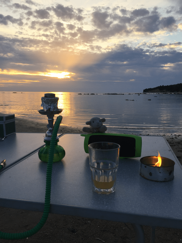 Gut, dann doch der Weg, der auf der Karte bis ganz runter führt. Tatsächlich haben wir beim vierten Anlauf Glück und der Weg führt runter bis zum Strand. Ein paar Fischerboote stehen direkt bei der Abfahrt in der Bucht. Ein Stückchen nach rechts halb durchs Wasser und über einen Baumstamm, an dem der Fischer sein Boot festgemacht hat, dann kommen wir zu unserem kleinen privaten Sandstrand. Es liegt einiger vom Meer angespülter Müll herum. Wir haben schnell einen Müllsack ausgepackt und ein bisschen zusammengeräumt. Jetzt ist es perfekt. Wir werden mit einem blutroten, wunderschönen Sonnenuntergang belohnt. Wir beschließen ein paar Tage zu bleiben. Wirklich seeeehr chillig hier.