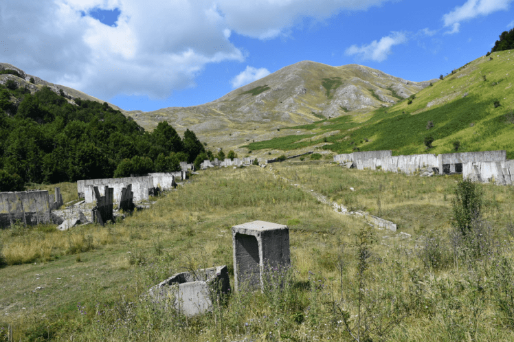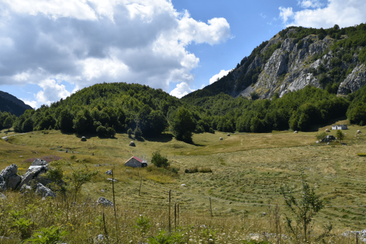 Als wir am nächsten Tag aus dem Wald rauskommen tut sich eine wunderschöne Almlandschaft auf. Wir kommen an riesigen verfallenen Gebäuden vorbei. Vermutlich eine ehemalige militärische Anlage. Es gibt wieder viel Fingerhut und verblühte Schneerosen. Weiter geht’s dann an einigen Schäferhütten vorbei. Überall stehen Heuschober, so wie man sie füher bei uns gesehen hat.