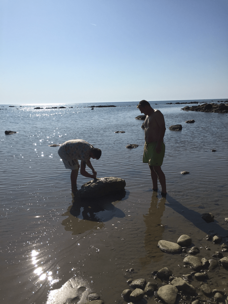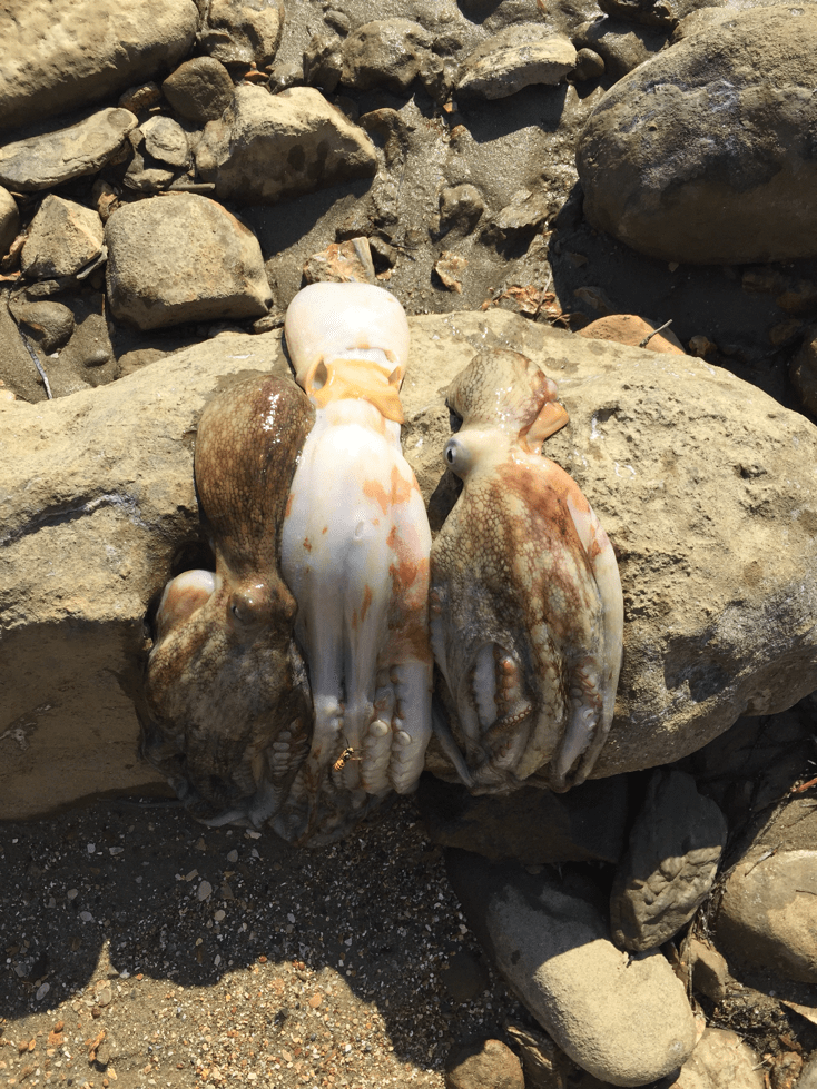 Hin und wieder fährt draußen ein Fischerboot vorbei, zwei, drei Leute spazieren den Strand entlang. Sonst keine Menschenseele. Außer ein Schnorchler, bewaffnet mit einer Stange. Er geht auf Oktopusjagt. Als er nach 3 Std zurückkommt hat er doch eine beträchtliche Menge Oktopussi aufgefädelt. Wir gehen zu ihm rüber. Wollen natürlich unbedingt frischen Oktopuss haben. Ein junger Mann, anfang Zwanzig. Leider versteht er kaum ein Wort englisch oder italienisch. Aber mit Händ und Füss kann man sich immer irgendwie verständigen (oder glaubt zumindest zu verstehen, was der andere meint). Er schenkt uns 3 Tiere seines Fanges und nimmt sie auch noch für uns aus. Sehr spannend, wusste ich bis jetzt nicht, wie das geht. Geld will er keines, Bier auch nicht, aber ein Cola nimmt er wenigstens.