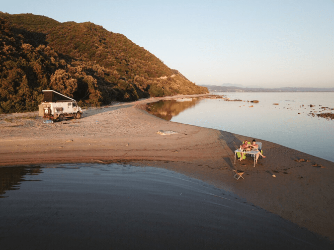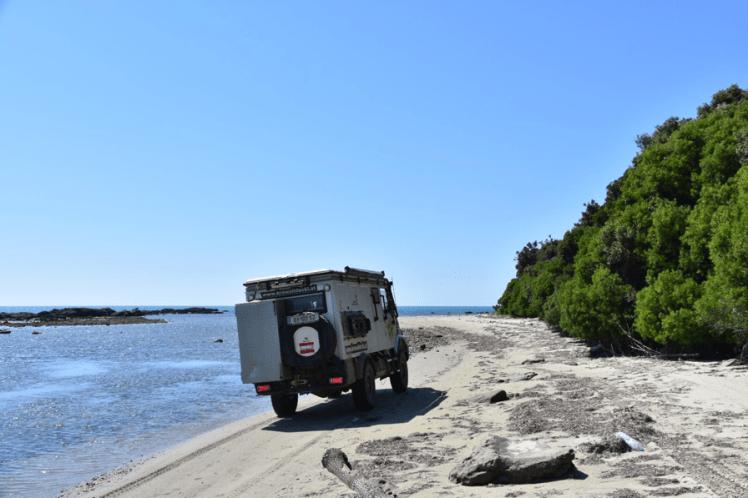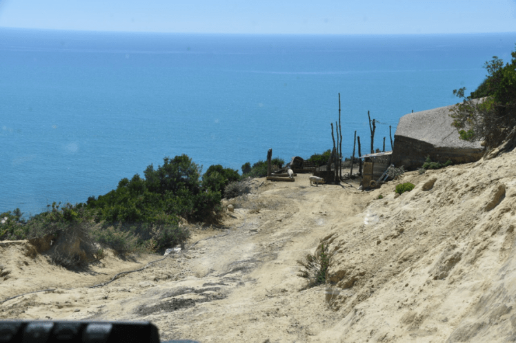 Am nächsten Tag hab ich mal genug von der ganzen Offroad Rumpelei. Ich will ein Chilliges Platzerl, wo man mal ein bisschen entspannen kann. Der Dackl sieht das auch so. Für ihn ist die ganze Fahrerei ja noch viel anstrengender als für mich. Wir haben einen Geheimtipp für einen kleinen Strand bekommen. Das kommt gerade recht, da wollen wir jetzt hin. Auf der Karte gibt es einen Weg dort hin und auch das Navi empfiehlt den selben Weg. Auf geht’s, kann ja nicht so schwer sein. An besagter Küste angekommen biegt der Weg schon recht dubios mitten im Dorf über eine Wiese den Hang hinauf ab. Gut, wir müssen auf die andere Seite des Horns. Der Weg ist ziemlich wild, aber es gibt Traktorspuren.