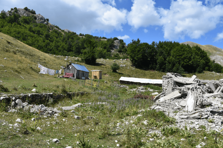 Der Weg wird wieder holpriger und unsere Lenkung beginnt zu tscheppern. Der Weg ist schmal und es gibt keine Ausweichen. Nachdem wir gestern und heute aber kein einziges Auto getroffen haben, denken wir, es ist ja kein Problem, wenn wir kurz stehenbleiben und schauen woran das tscheppern liegt. Wir stehen gerade mal 3 Minuten und haben die Fettpresse ausgepackt zum Abschmieren des Lenkgestänges, schon kommt aus der anderen Richtung ein Auto. Gibts ja nicht. Es steigen 3 Männer aus, freuen sich uns zu sehen und wollen gleich Fotos machen. Es sind die Parkranger des Nationalparkes in d m wir gerade sind. Wir haben gleich Spaß miteinander, trinken Zirberl, Nuß und Rakí (alle Albaner haben immer und überall Rakí mit). Der Ranger sagt uns, dass es Rehe, Wölfe, Wildschweine und Bären gibt. Ich frage ihn nach den Schäfern und er meint, die wohnen das ganze Jahr dort oben. Also anders als im Lura Nationalpark. Aber ich kann mir das schon vorstellen, denn sie haben hier richtige Hütten und Steinhäuser und nicht nur einfach Verschläge aus Ästen und Plastikplanen.