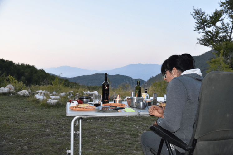 Nach dem kleinen Dorf kommen wir in dichtes Waldgebiet. Wieder keine Aussicht auf einen Schlafplatz, aber wenigstens keine Schrägfahrten mehr am Abgrund. Schön langsam werd ich nervös, es ist schon 18:00, wir sind müde und ich habe für heute genug. Auf der Karte werden die engen Höhenlinien bald etwas weiter. Vielleicht haben wir ja doch bald Glück und es tut sich eine Ebene auf. Und siehe da, nach wenigen hundert Metern zweigt ein Wegerl vom Hauptweg, der noch immer von dichtem Wald umgeben ist, ab, und führt auf ein kleines Plateu mit super Aussicht. Juhuuuu, der Schlafplatz ist gefunden! Zur Feier des Abends gibts ein Flascherl Big John zum Steak.