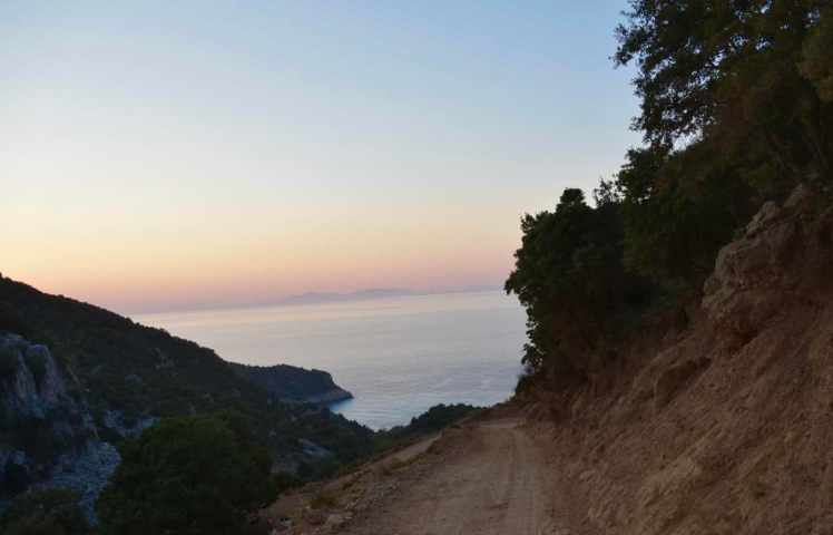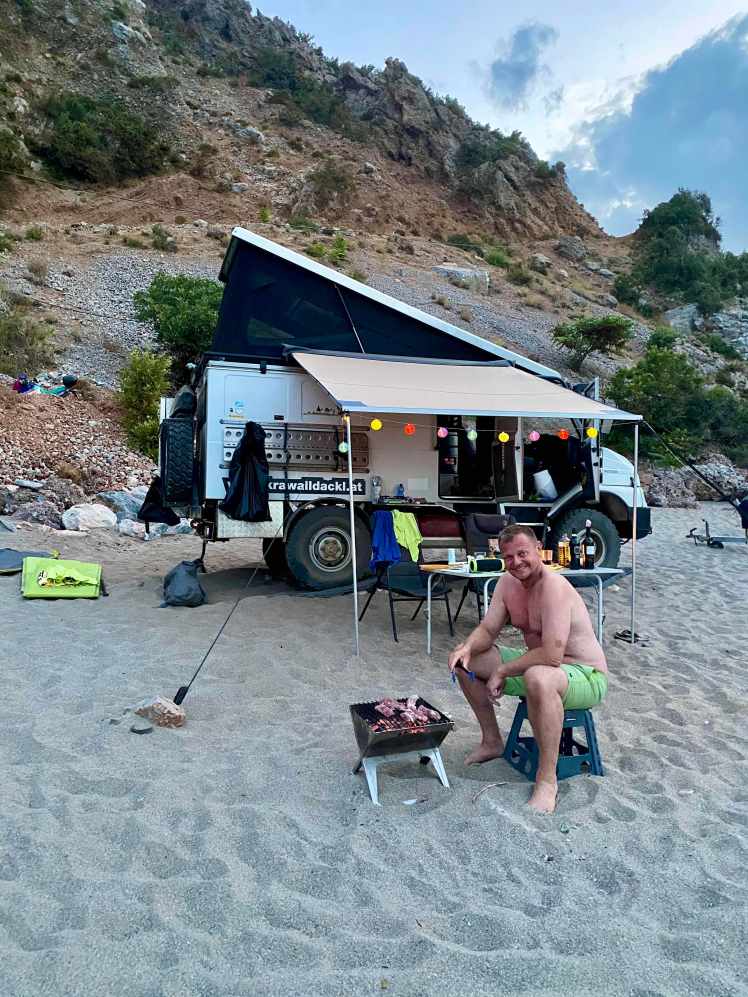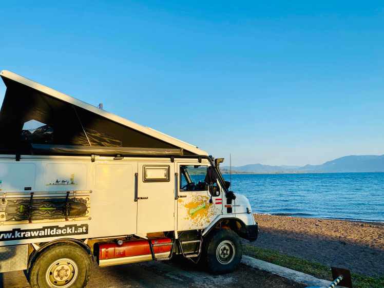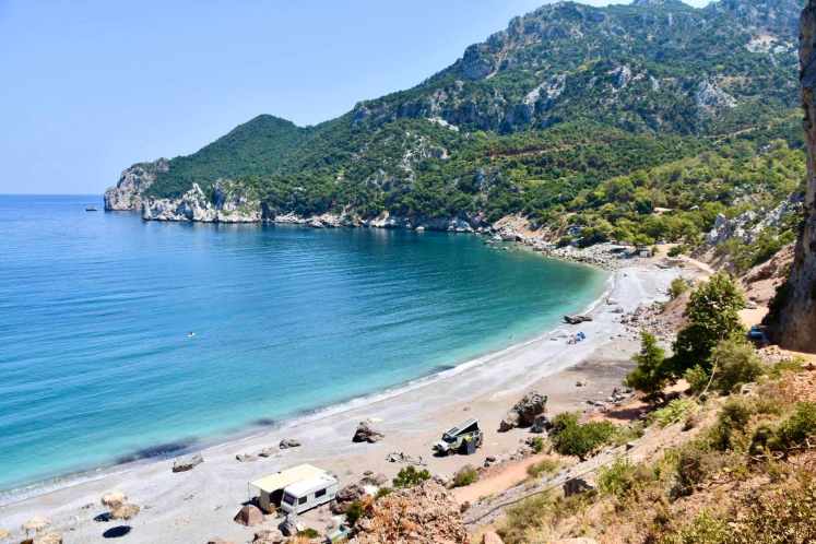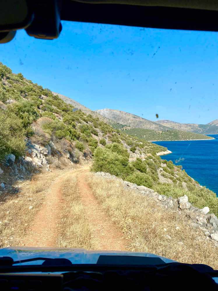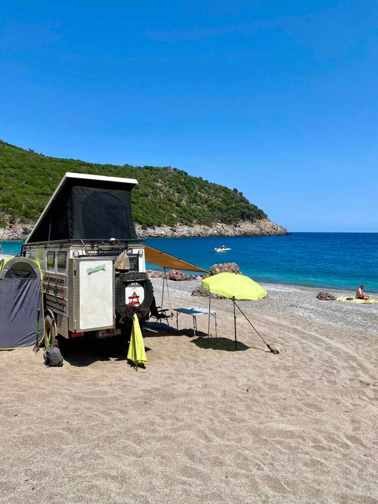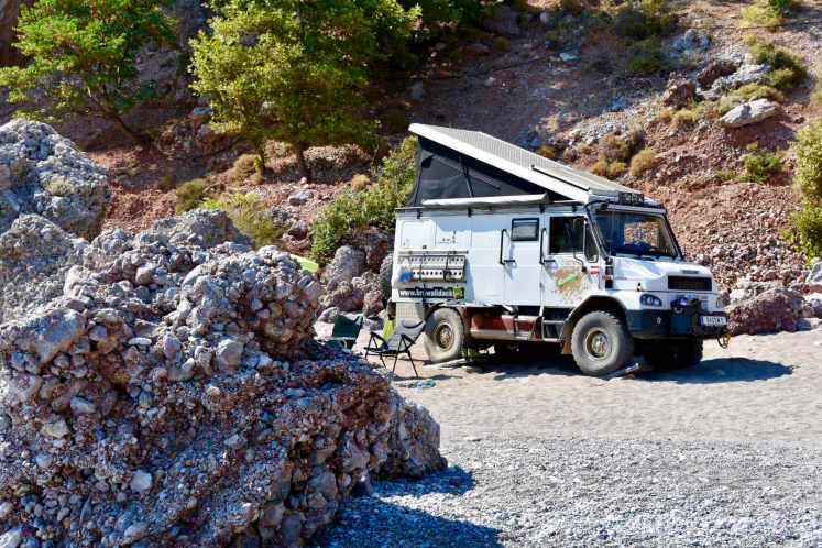 Wir kommen in Boyfalo raus, einem lieben kleinen Ort mit netten Tavernen und einem kleinen Hafen. Aber es ist hier so windig, dass ein Bleiben unmöglich ist. Es ist schon 17:30 und immer noch kein Schlafplatz in Sicht. Zum Glück haben wir von Maria von Ko.Ma.land (http://koma.land/ ) ein paar Tips bekommen, darunter auch ein Strand, der sehr schön sein soll. Und so machen wir uns auf den knapp 3 stündigen Weg in den Nordosten. Nach der Abzweigung zum Strand fahren wir einen 7km langen (sehr staubigen) Feldweg richtung Meer hinunter. Gegen 20:30 kommen wir am CHILLaros Beach an. Einige „Dauercamper“ haben ihre Wohnwägen am Strand platziert, ein paar Zelte sind aufgeschlagen. Insgesamt für die große Bucht, die eingebettet in schroffe Felsen ist, aber sehr wenig Leute. Es gibt dort seit einer Woche eine kleine Strandbar und wir fragen ob wir mit dem Auto am Strand stehen können. Alles kein Problem, alle sehr gechillt hier. Wir haben ein ruhiges Platzerl auserkoren und hoffen, dass wir uns nicht eingraben. Das Nivellieren des guten Bremis war eine kleine Herausforderung, aber 15 Min. später