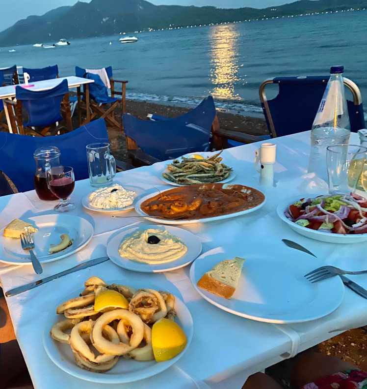 Wir haben’s dann am ersten Tag in Griechenland nicht mehr ganz nach Evia geschafft, aber dank der Trip Adviser Funktion des neuen Garmin Overlander Navis haben wir ein klein wenig abseits der Route in einem beschaulichen kleinen Orterl eine sehr gute Taverne direkt am Strand gefunden. Inkusive Schlafplatz am Hafen/Dorfplatz. Das Essen war vorzüglich, die besten Shrimps Saganaki ever. Von der zweitägigen Anreise (über Slowenien, Kroatien, Serbien, Bulgarien) ziemlich ermüdet haben uns auch die bis weit in die Nacht am Dorfplatz lautstark spielenden Kinder nicht gestört und sind wir nach dem Essen quasi ins Koma gefallen.