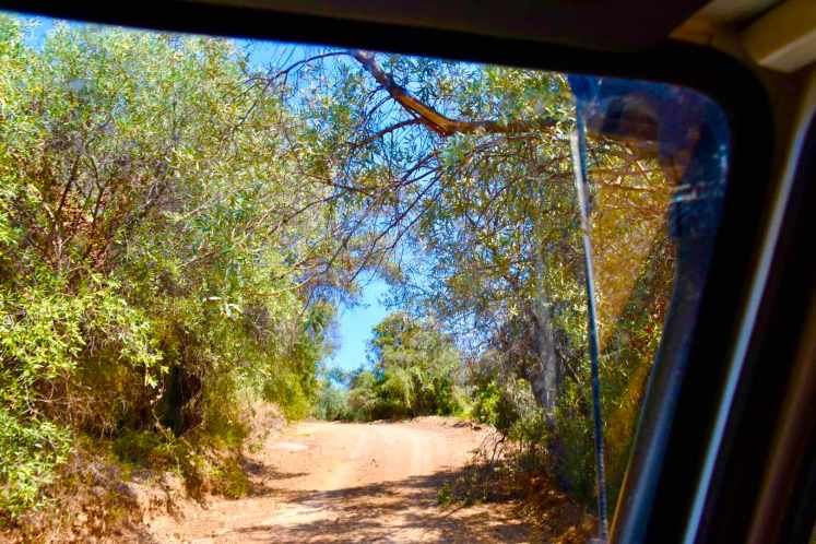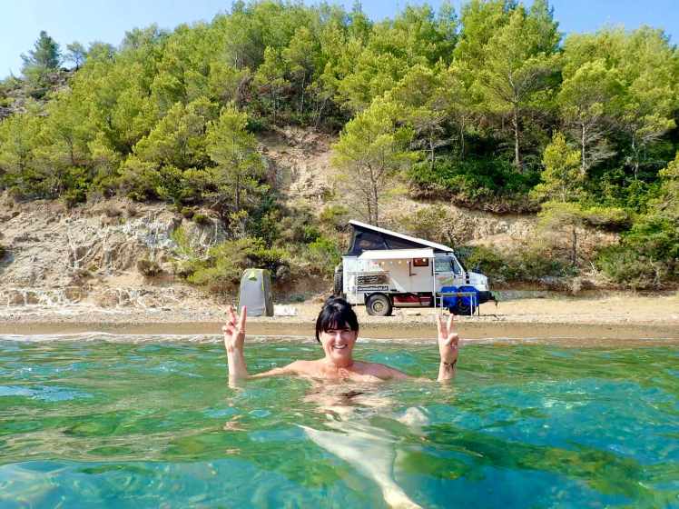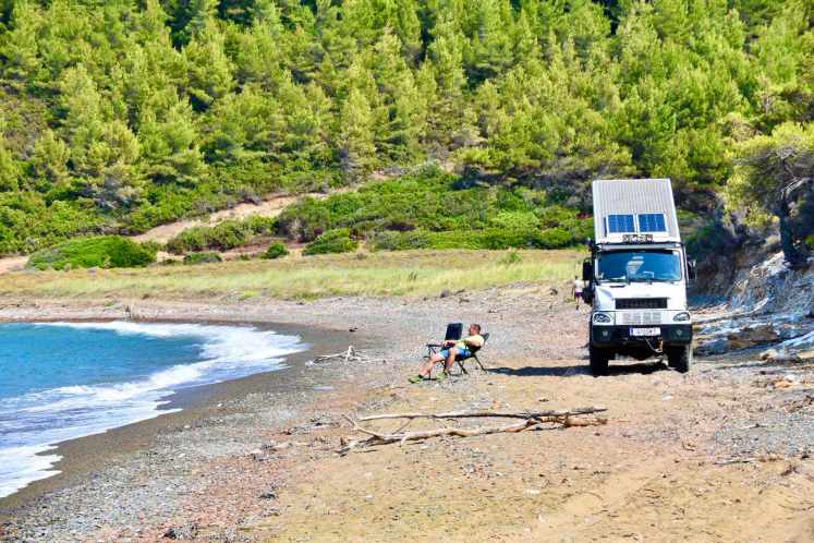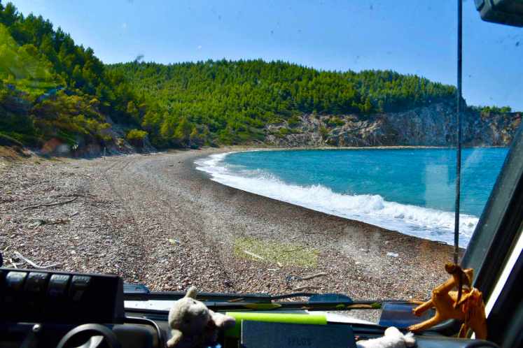 Wir nähern uns unserem auserkorenen Ziel und die Spannung steigt. Was wird uns diesmal erwarten? Juhuuu wir kommen ganz runter zum Meer. Der Strand ist etwas wild, mit angeschwemmtem Holz und Seegras. Ganz hinten hat jemand sein Zelt und einen Verschlag aufgebaut, aber es scheint schon länger keiner hier gewesen zu sein. Keine Menschenseele zu sehen. Die Wellen dosen laut, die Zikaden versuchen sie mit ihrem gezirpe zu übertönen. Die Klippen sind von weißen Gesteinsadern durchzogen. Eine herrliche Kulisse! Wir freuen uns, dass wir ein Platzerl gefunden haben an dem wir ganz alleine sind, parken den Bremi nur 5 Meter vom Meer entfernt ein und genießen unseren Sundowner.