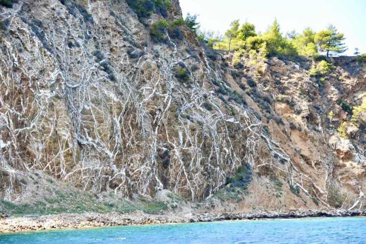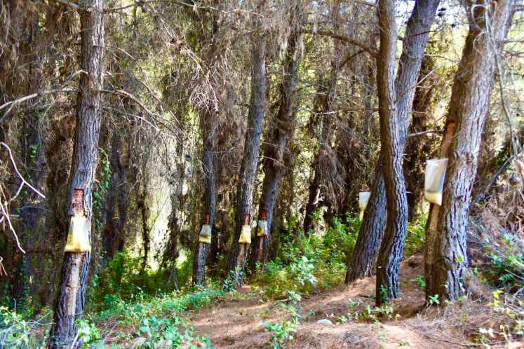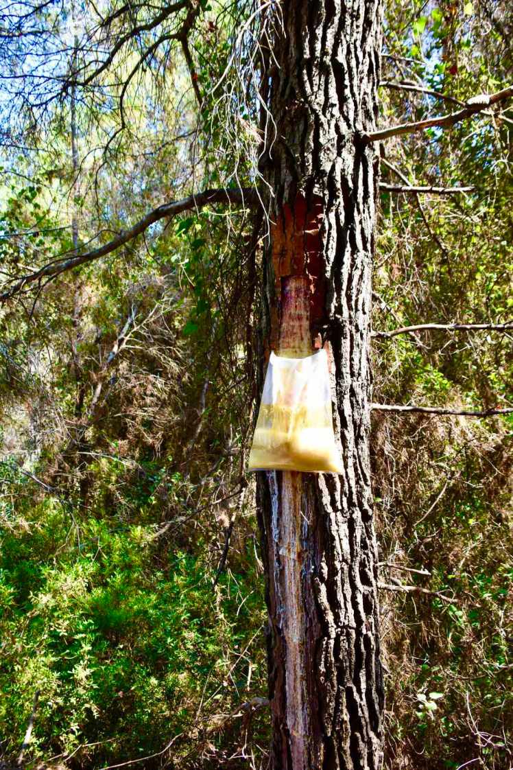 Sowas in der Art hab ich bis jetzt nur in einer Dokumentation über Kautschukherstellung gesehen. Aber Kautschuk auf Evia? Dann die Eingebung – was ist typisch griechisch und harzig – Retsina! Und meine Nachforschungen ergaben, dass Euböa eines der wichtigsten Erzeugungsgebiete für Retsina ist. Früher war das Harz ein Mittel zu Konservierungszwecken, die Amphoren wurden damit versiegelt. Heute gibt man bei der Gärung des Weines ein bisschen Harz dazu, um den Geschmack nachzuempfinden.