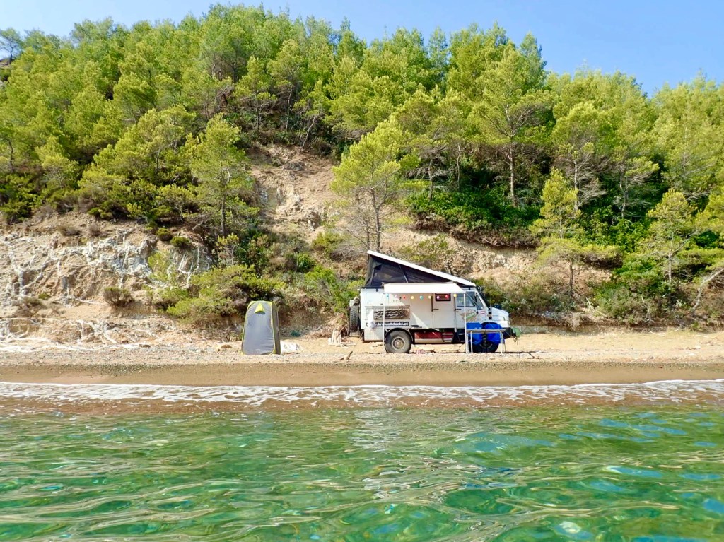 Wir fahren über die Kuppe in den Pinienwald und schon bald haben wir am Wegesrand einen „Notschlafplatz“ gefunden der recht windstill ist. Der Himmel ist auch hier immerfort von grellen Blitzen erleuchtet. Einmal regnet es kurz ein paar Tropfen.