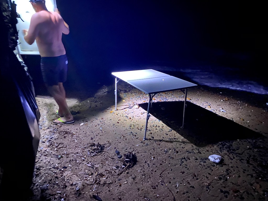 Am Vortag freuen wir uns noch, dass wir direkt am Strand 5 Meter von der Wasserlinie entfernt stehen, heute Abend ist das plötzlich nicht mehr so lustig.
