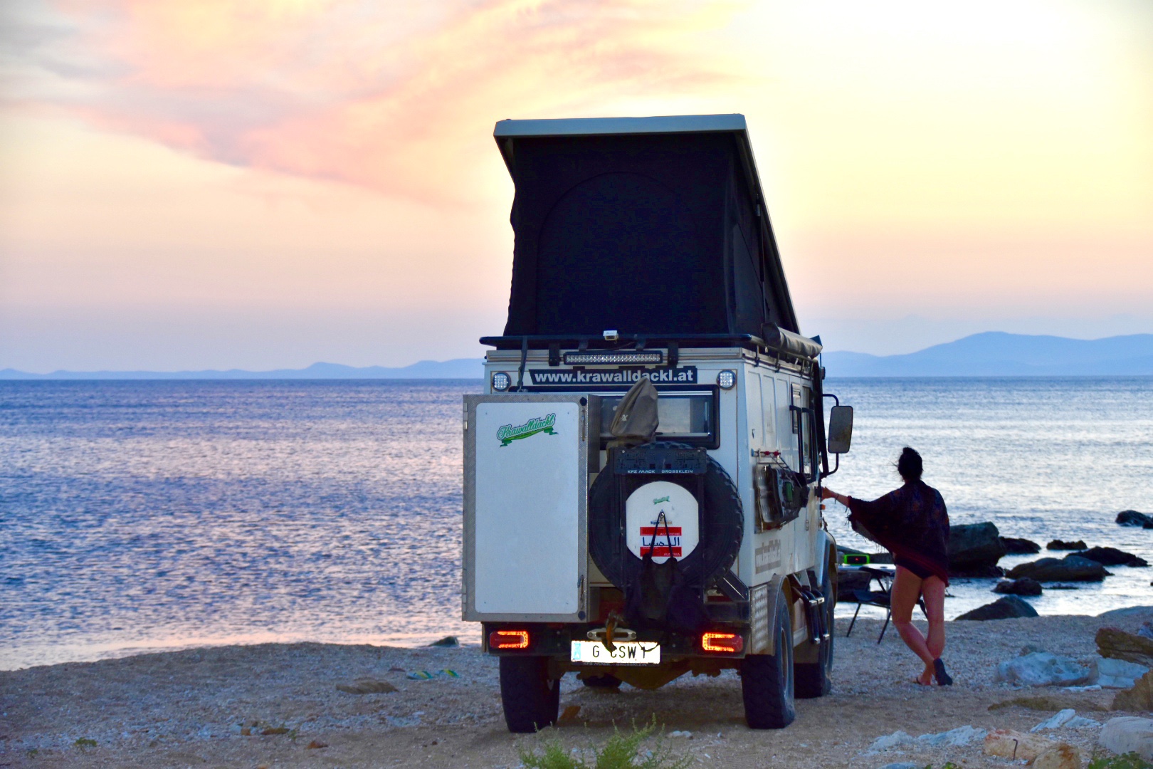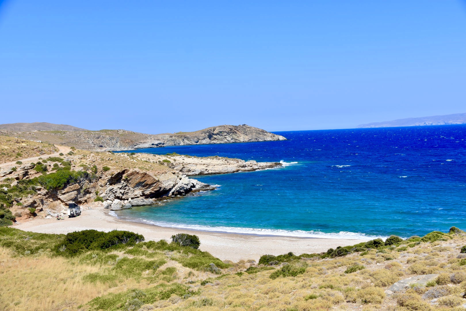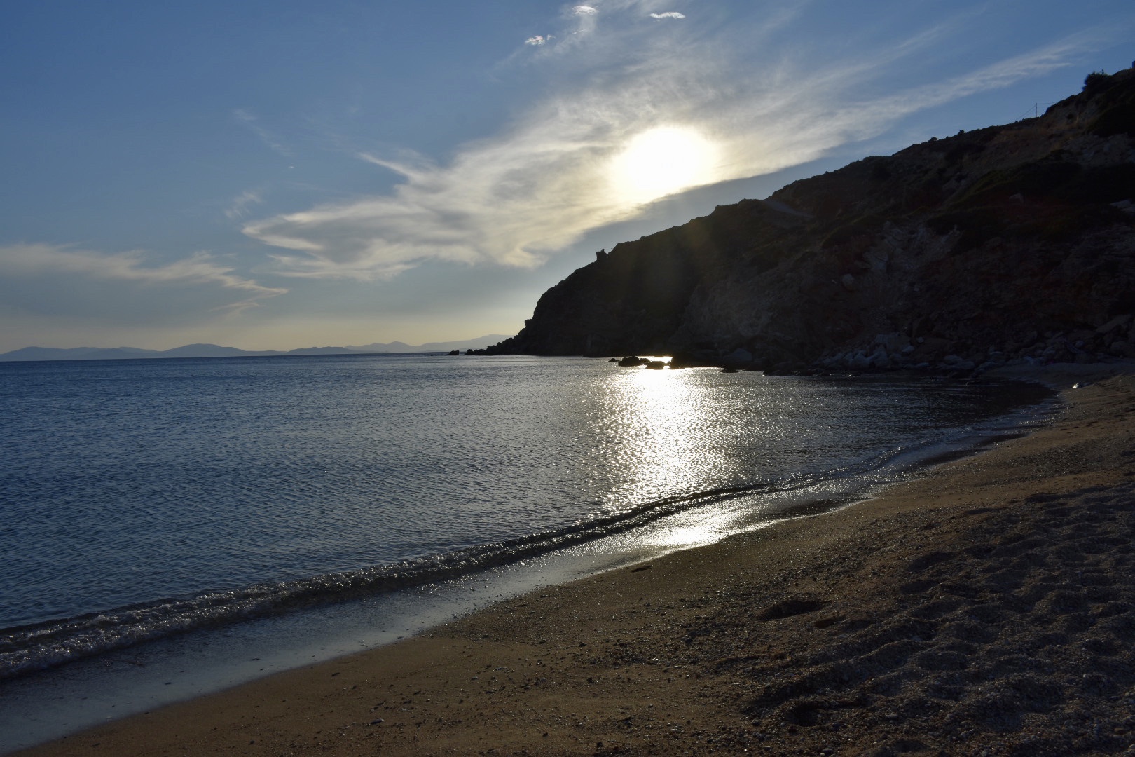 Vielleicht wäre es besser, im Süden zu bleiben und die westliche Seite auszuprobieren? Das machen wir dann auch. Gleich nach Karystos gibt viele Strände. Das Meer ist hier wirklich etwas ruhiger, der Wind nicht so stark. Aber wir sind noch zu nahe an der Zivilisation.