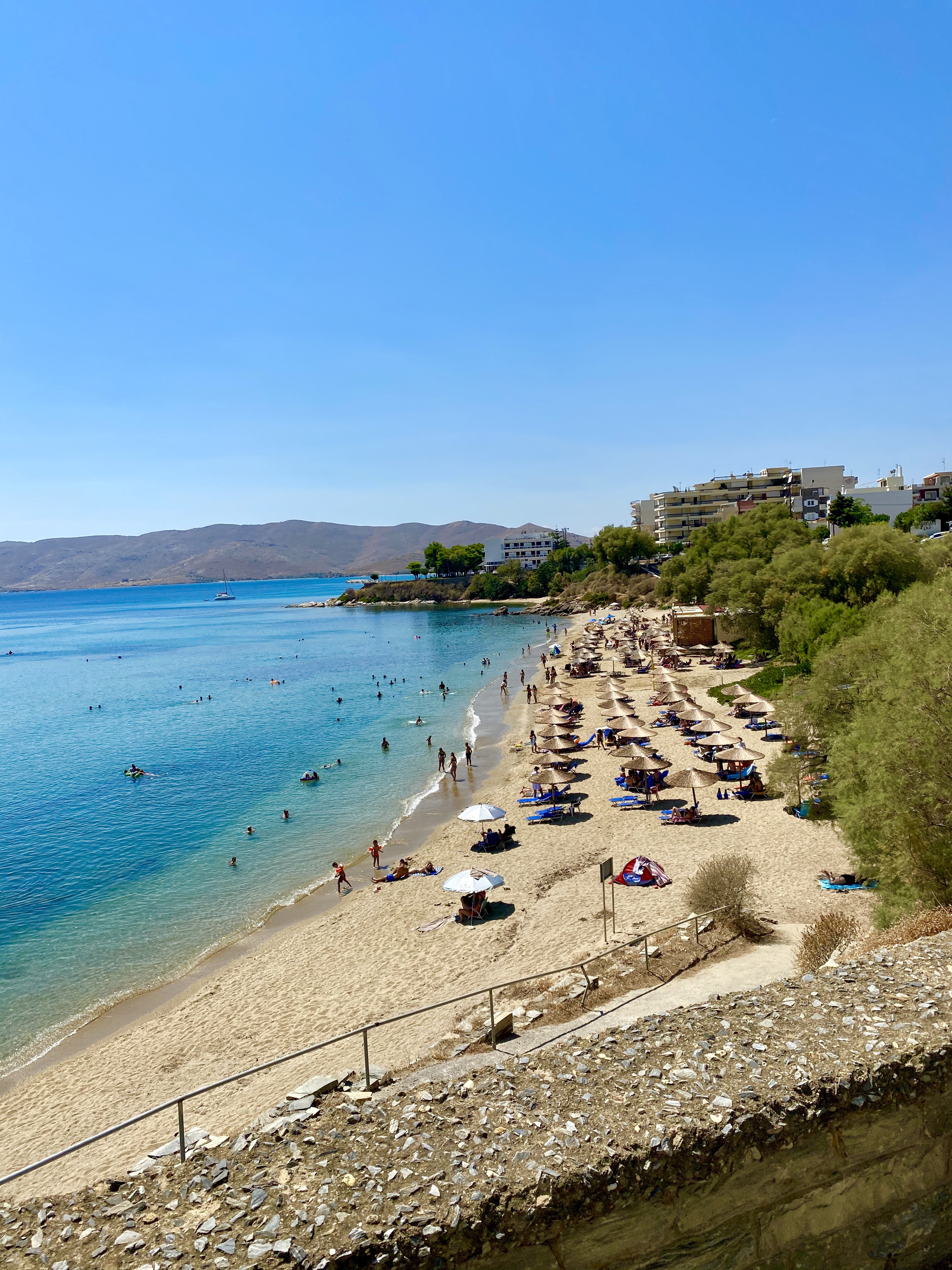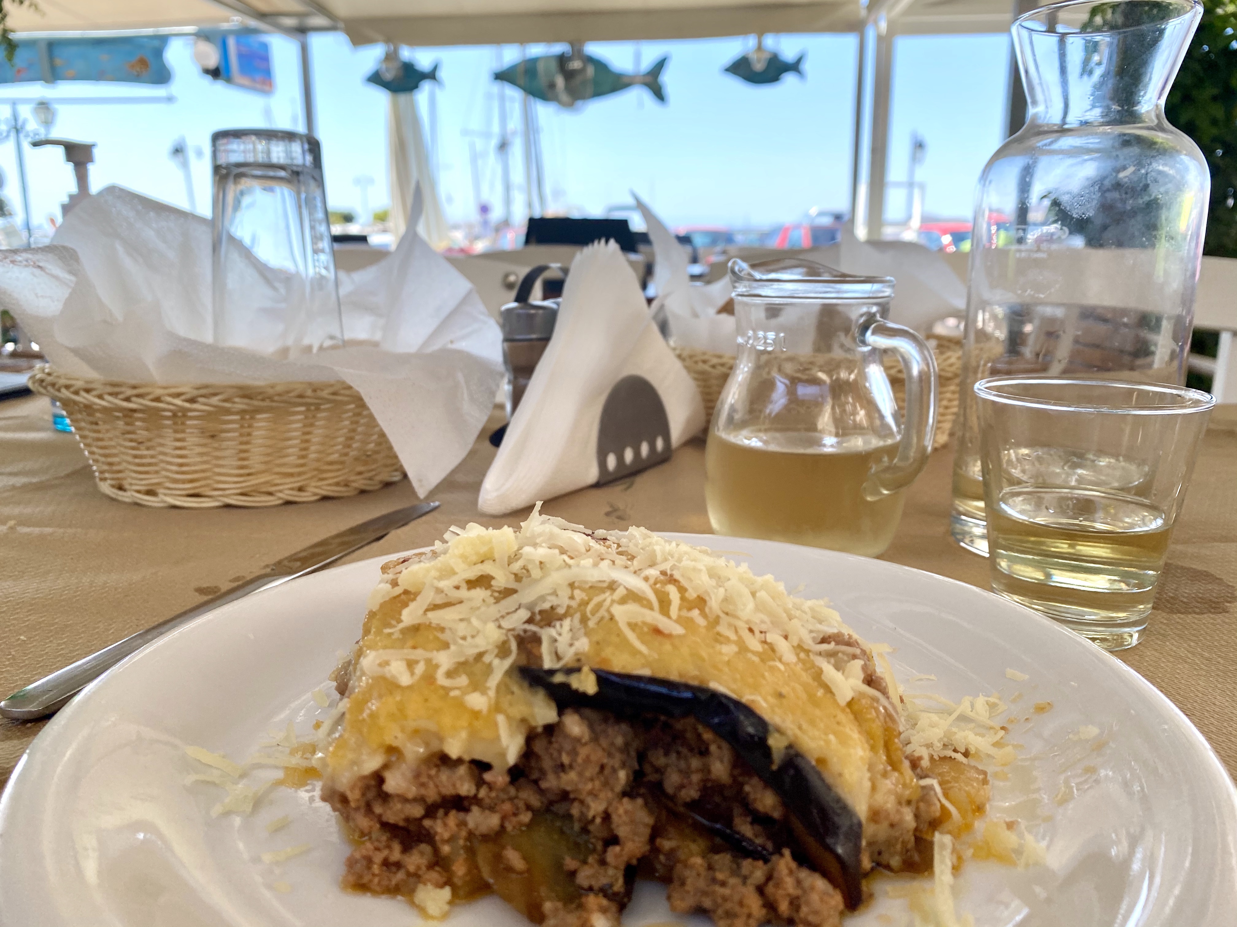 An der Hafenpromenade nehmen wir noch ein kleines Frühstück ein. Der junge Kellner versteht kaum englisch, wir bestellen Taramas und Auberginenpaste, bekommen zusätzlich noch einen Teller mit grünem Blattgemüse, das wir nicht bestellt haben. Aber ein bisschen Gemüse schadet nicht, also essen wir es. Aber was ist das? Sieht ein bisschen aus wie junger Spinat oder Mangold, ist aber keines von beiden, die Blattstruktur ist etwas anders. Schmeckt sehr fein! Als der Chef des Hauses, der sehr freundlichen ist, kommt, fragen wir ihn, was das ist. Wlita sagt er. Ein typisches Gemüse, dass jetzt Saison hat. Noch nie davon gehört. Als ich später google, finde ich herau, dass das die Blätter der Amaranth Pflanze sind. Muss ich mir merken, hat echt gut geschmeckt! Außerdem lassen wir uns vom Chef noch zu einer Portion Moussaka überreden, obwohl wir eigentlich schon satt sind. Aber es ist gerade frisch aus dem Ofen gekommen und duftet herrlich. Und es schmeckt auch herrlich!