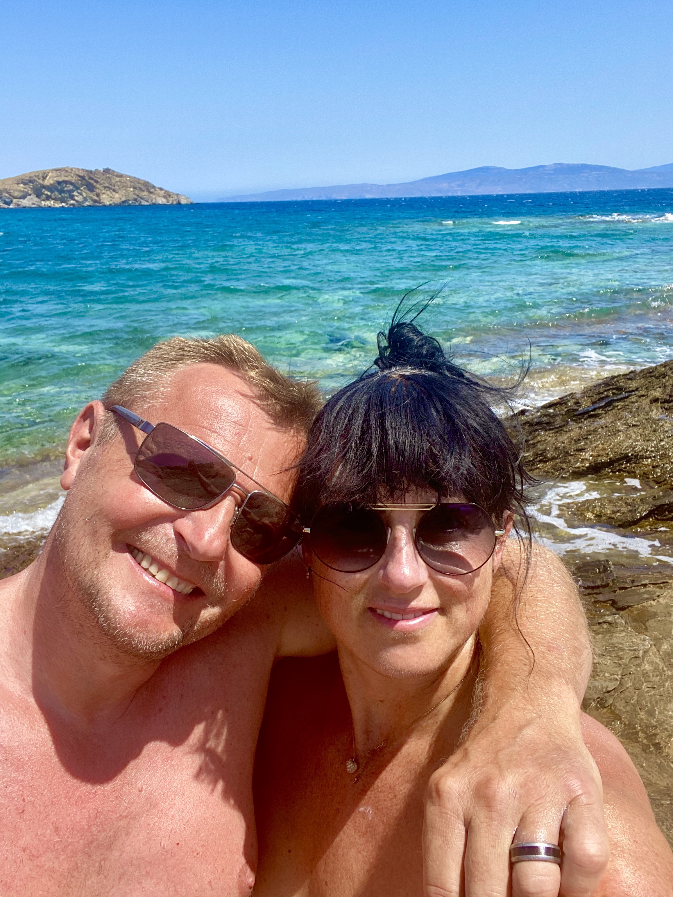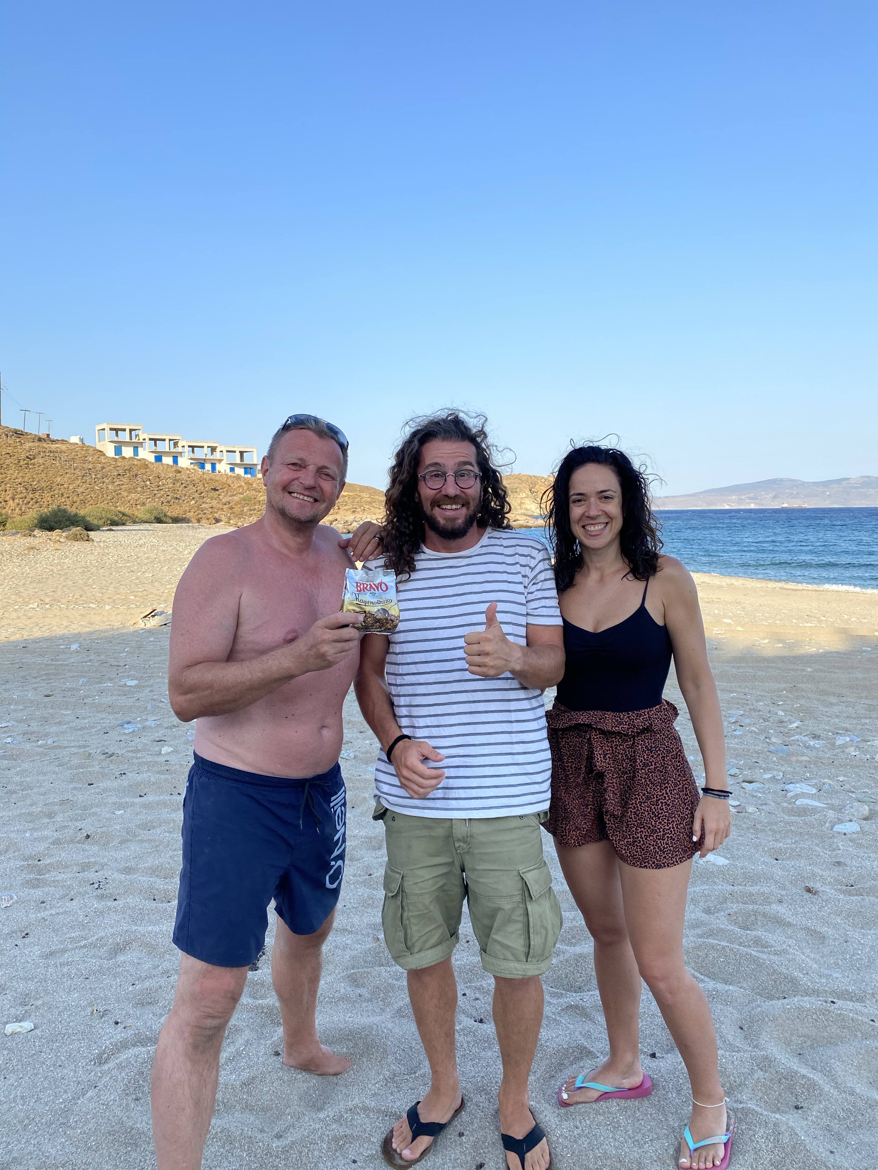Am 3. Nachmittag kommt ein älteres Paar mit Campingausrüstung an. Sie fragen uns sehr nett, ob wir ihnen das Plateau mit dem Olivenbaum überlassen können, sie wollen da für die nächsten 2 Wochen ihr Zelt aufschlagen. Auch sie sind aus Athen und kommen schon das 6. Jahr hier her an den Strand.