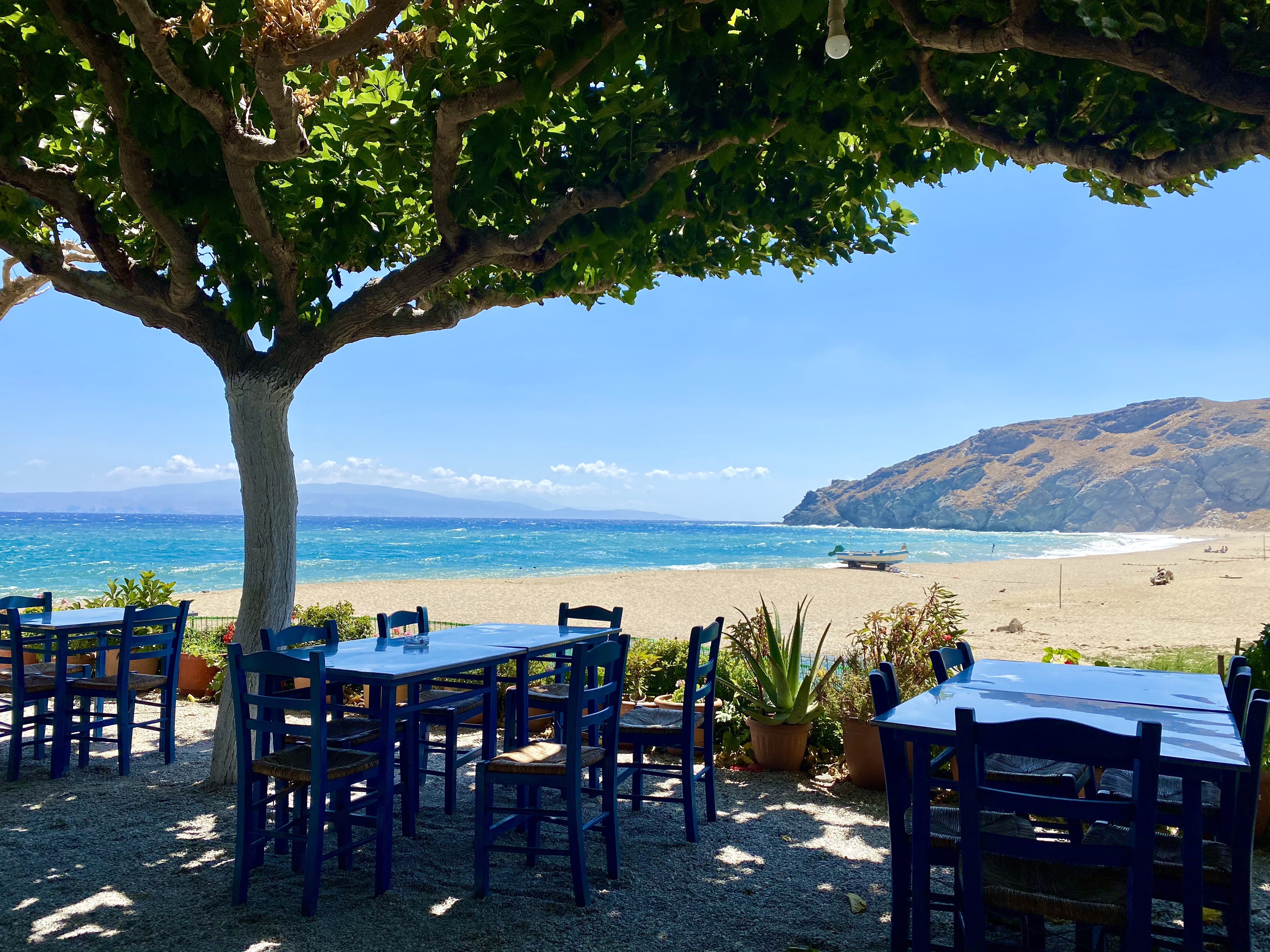Es gibt eine nette Taverne am Ende des Strandes etwas oberhalb. Es ist ca 11:15 Uhr und da wir kein Frühstück hatten, haben wir beschlossen eine Kleinigkeit zu essen. Es ist noch nichts los und die Wirtin spricht kein Englisch. Bis sie uns verständlich gemacht hat, dass es erst ab 12:30 etwas zu Essen gibt, hat’s etwas gedauert. Also mit leerem Magen weiter zu dem Strand der auf Google Earth am vielversprechendsten ausgesehen hat.