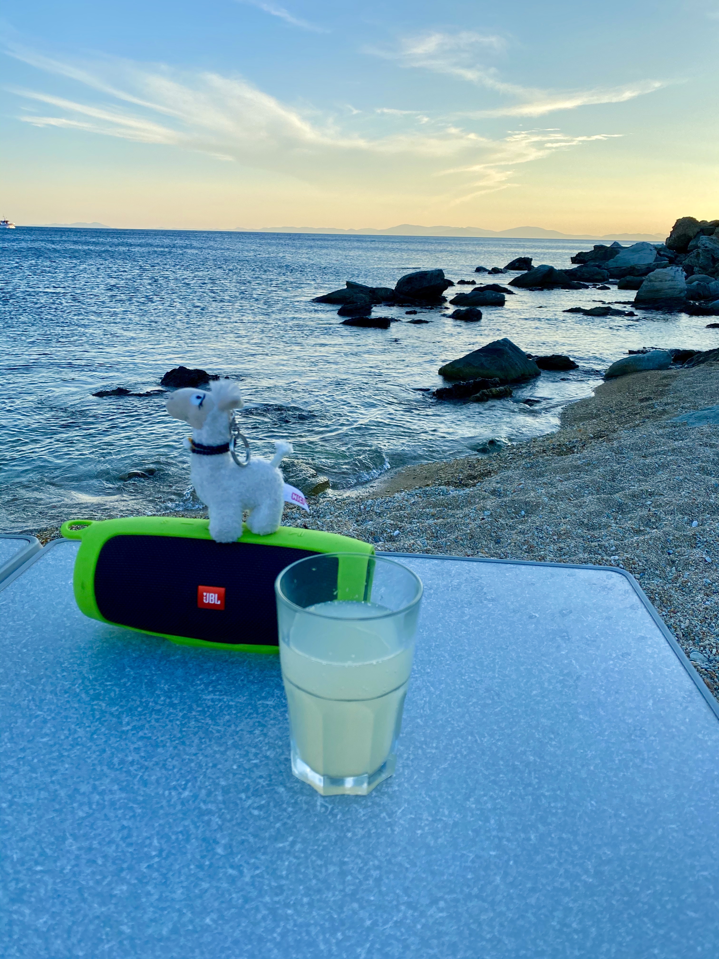 Mittlerweile geht auch hier der Sturm so stark, dass wir im Schatten unter den Platanen ein Westerl brauchen um nicht zu frieren. Die geschmorte Ziege in Zitronensauce und der süffige Hauswein entschädigen uns ein wenig für die Sturm-Niederlage.