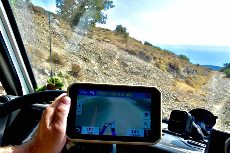 Einmal will uns das Navi einen „Weg“ der nur mit äußerst viel Phantasie als solcher zu erkennen ist einen Steilhang links hinauf routen. Da habe ich Christian ZUM ALLERERSTEN MAL ÜBERHAUPT sagen gehört: „das ist unfahrbar, da fahr ma nicht!“ Leider ist auch der Weg, auf dem wir uns gerade befinden gleich darauf bei einem Viehverschlag zu Ende. Also umdrehen nahe am Abgrund und neuen Weg suchen.