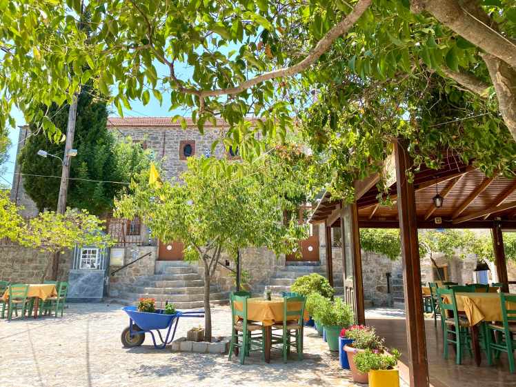 Alle paar Tage, wenn wir Futter oder Wein brauchen, verlassen wir den Strand und ziehen weiter. So kommen wir nach Avgonima, ein sehr altes Dorf mit teilweise schön renovierten alten Steinhäusern. Wir trinken ein Bier und plaudern ein bisschen mit der Wirtin. Die Taverne war früher eine Schule, in die noch ihr Vater als Kind gegangen ist. Dann ist die Familie nach Amerika ausgewandert und sie ist dort aufgewachsen. Vor einigen Jahren ist die Familie nach Chios zurückgekehrt.