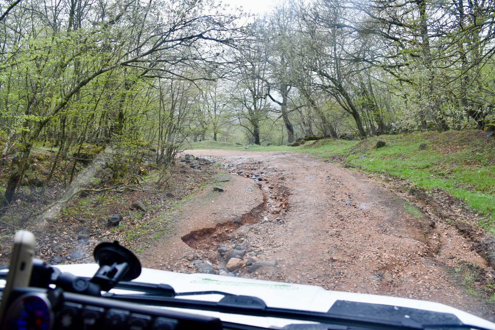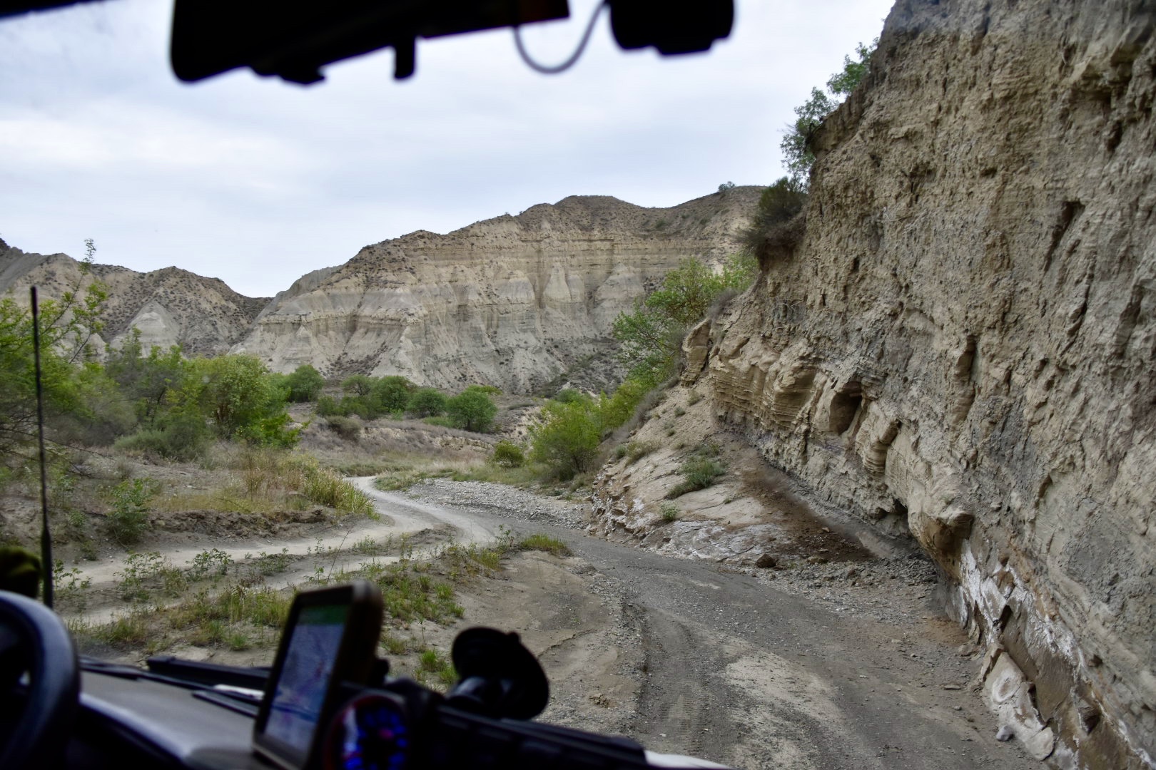 Entlang der aserbaidschanischen Grenze ist es kilometerlang sehr karg. Wir haben Glück und sehen ein paar der Gazellen, die sich dort wieder angesiedelt haben. Irgendwie verfehlen wir den richtigen Weg und müssen auf einmal eine ziemlich steile und schräge Stufe hinunter in ein Flußbett. Das ist der erste Moment, in dem ich so richtig Angst bekomme und das offroad Fahren wieder mal verfluche. Der Dackl nimmt’s entspannt und meistert die Abfahrt ohne mit der Wimper zu zucken, während ich mit geschlossen Augen draußen stehe. Das sehr breite Flußbett führt (momentan) kein Wasser und ist der offizielle Weg.