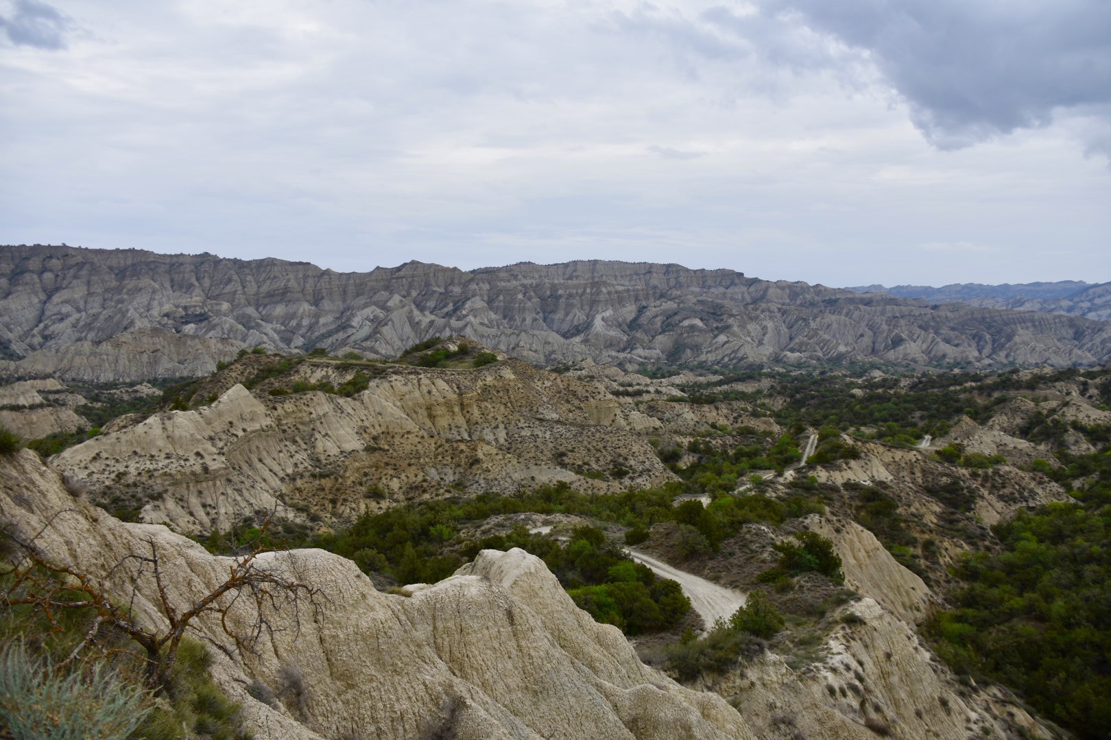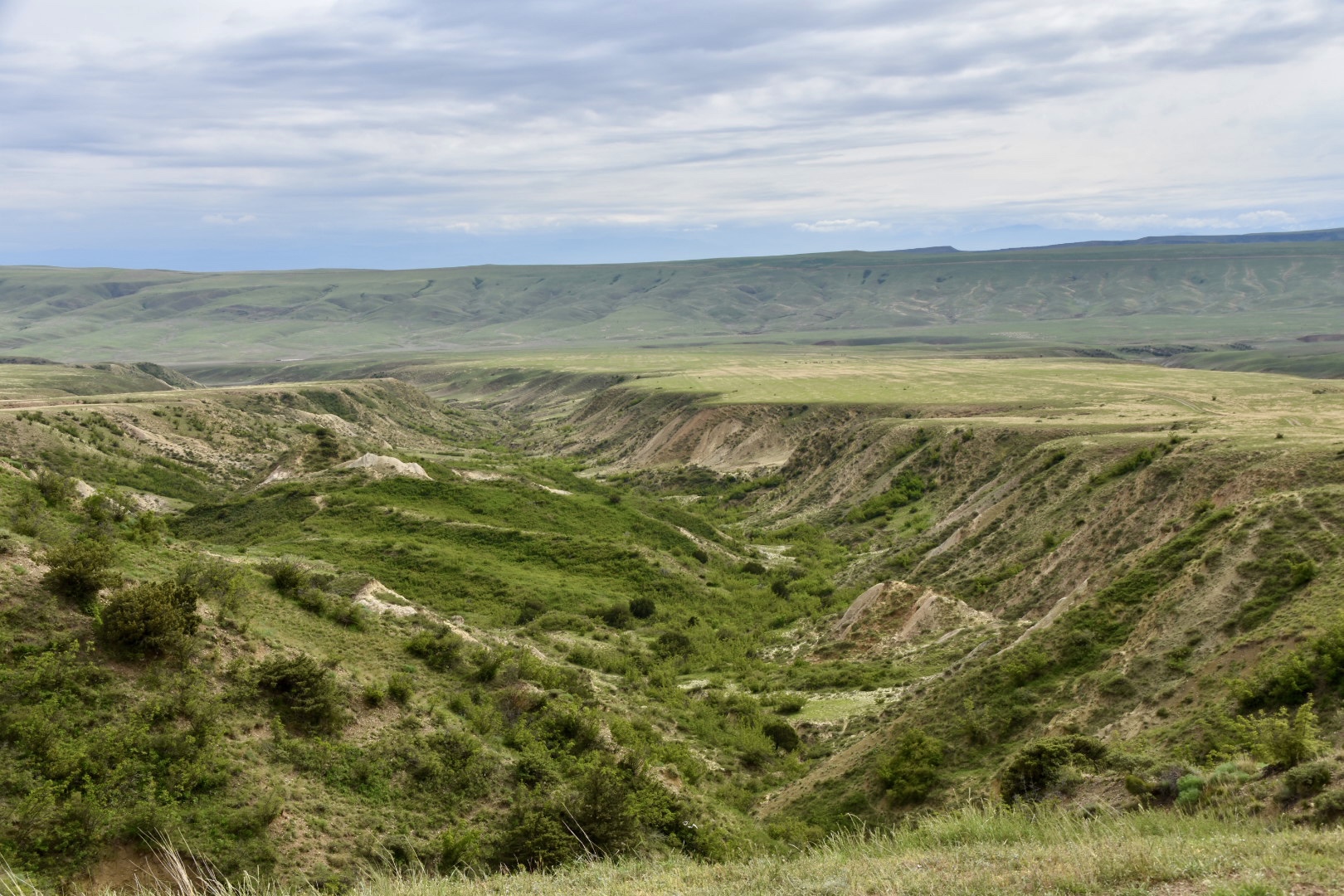 Wir verlassen den Nationalpark und steuern wieder auf Dedoplistskaro zu, da wir Vorräte brauchen. Ich will nicht den selben Weg zurück fahren, es sind ja viele kleine Wegerl eingezeichnet, durch die unendliche Felderlandschaft, die sich hier erstreckt. Aber die Karte ist hier nicht 100%ig genau, beziehungsweise gibt es in Natura viel mehr Wege, als auf der Karte und so verfranzen wir uns schon wieder und fahren plötzlich auf einem Hügelgrad entlang, wo schon sehr sehr lange niemand mehr gefahren ist. Der Ausblick ist wunderschön, aber leider ist es hier sehr schräg, sodass wir ein ziemliches Stück mit 20 Grad Seitenlge fahren müssen. Schon wieder nichts für meine schwachen Nerven. Aber umdrehen ist hier unmöglich. Ich gehe die paar hundert Meter lieber zu Fuß.