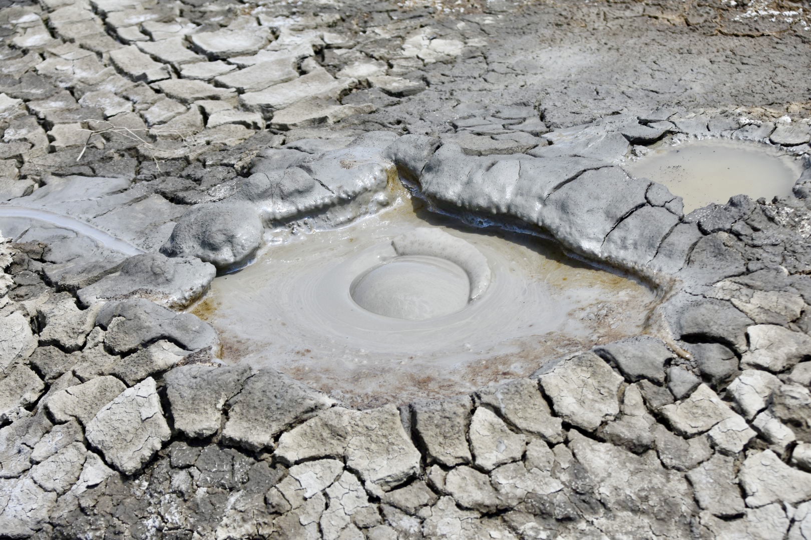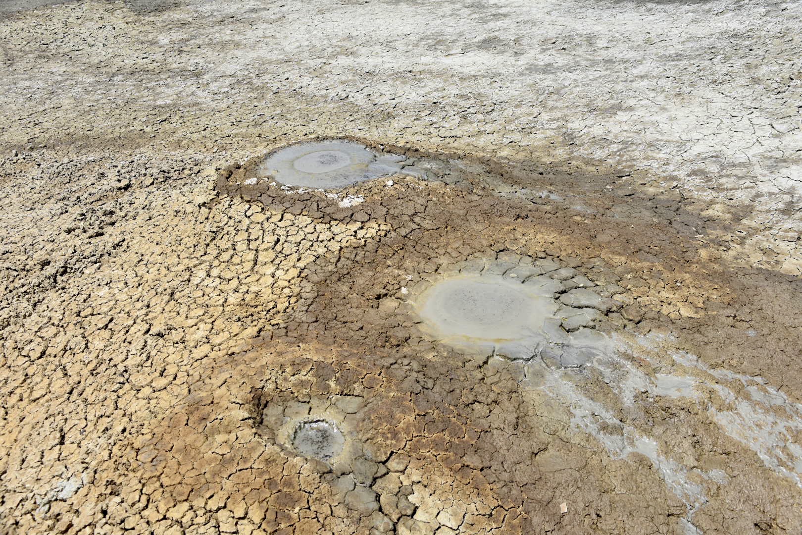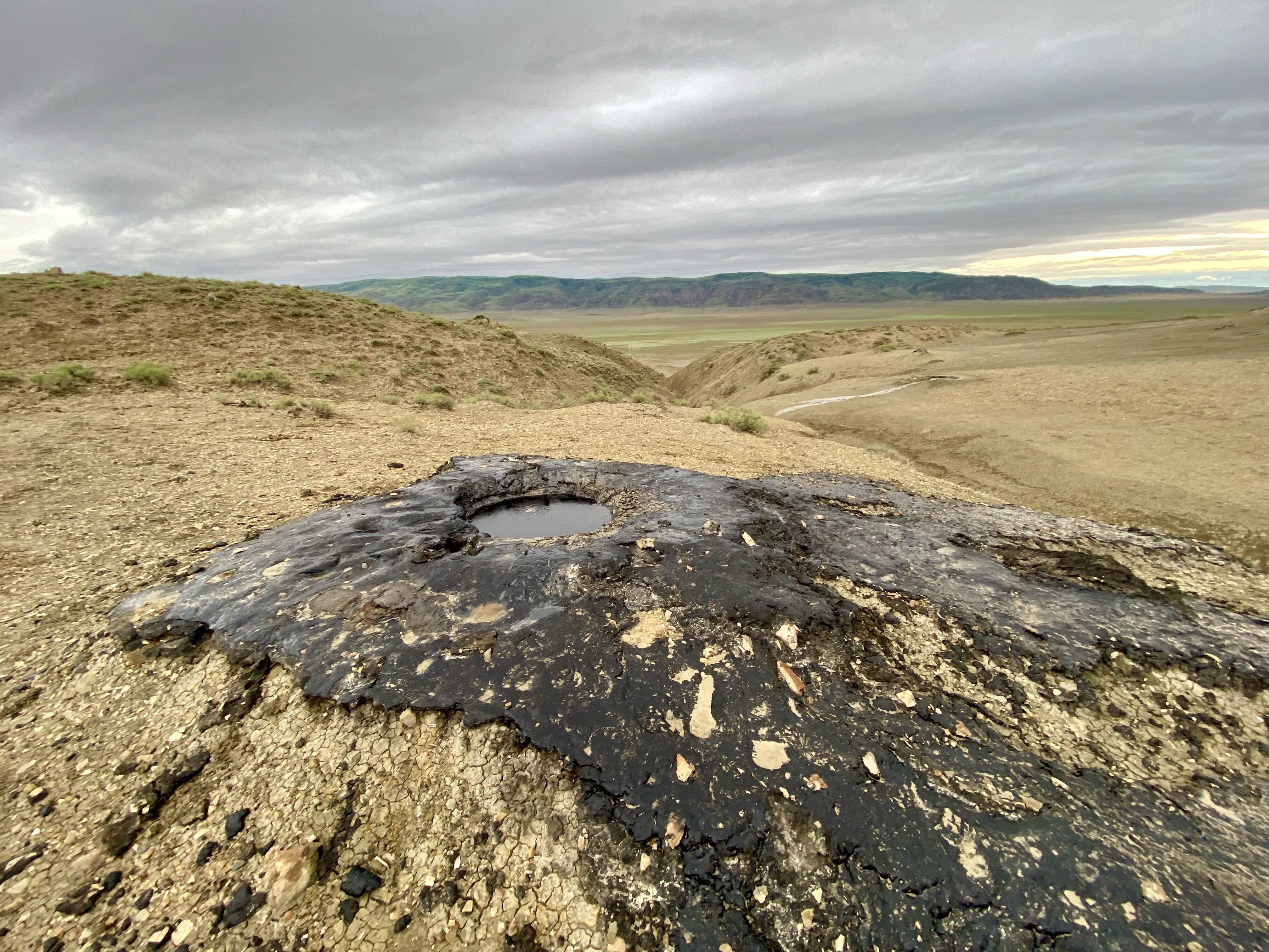 Nach ein paar Irrwegen (Weg ist plötzlich aus, Weg steuert direkt auf aserbaidschanische Grenze zu etc.) und Drifts können wir den Hügel besteigen, auf dessen Spitze sich einige kleine Krater befinden, aus denen gemütlich teilweise ein schwarzes teerartiges Etwas herausblubbert, teilweise brauner Schlamm. Schon seltsam, die Natur. Und schön.