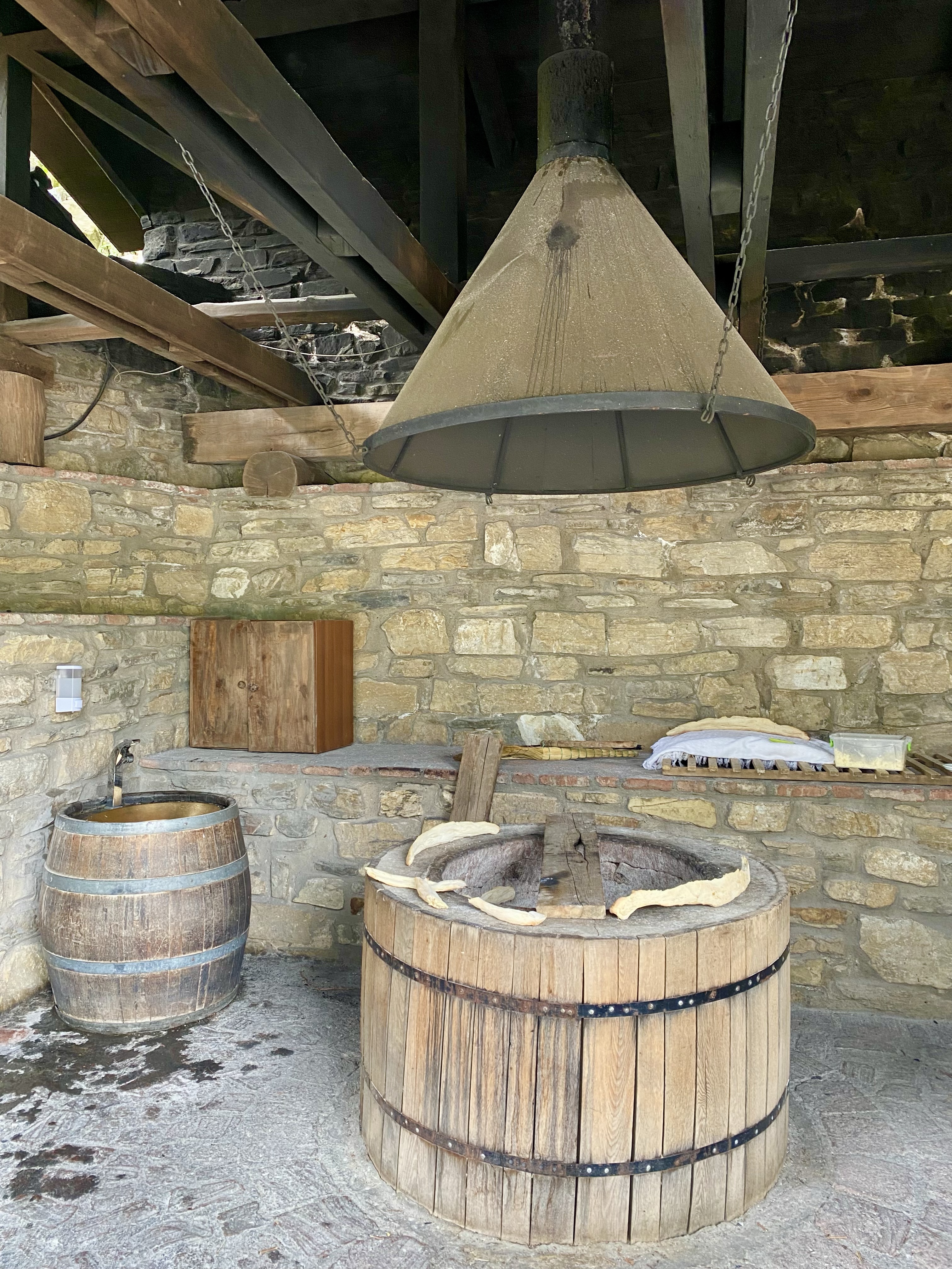 Am nächsten Morgen bekomme ich vom Herrn des Hauses gleich ein Glas Wein zum Frühstück (Christian bekommt keines, denn es gelten 0,0 Promille im georgischen Straßenverkehr). Dann gehen wir noch schnell auf den Markt um die Vorräte aufzustocken, bevor wir das Weingut Khareba besuchen, das den längsten unterirdischen Stollen (7,7 km) als Weinlagerstätte besitzt und sowohl Wein nach traditioneller georgischer Methode – Qvevri – herstellt, als auch nach europäischer Methode. Bei der Weinverkostung stellen wir fest, dass uns die Weine nach Qvevri Methode besser schmecken, wenn wir beide Herstellungsmethoden mit der selben Rebsorte verkosten. Es können hunderte autochone Rebsorten differenziert werden, 38 davon sind offiziell für den kommerziellen Weinbau zugelassen. Das Weingut ist ziemlich touristisch aufgezogen, man kann dort sein eigenes Brot backen und andere georgische Köstlichkei zubereiten, die man dann auch gleich verspeisen kann.