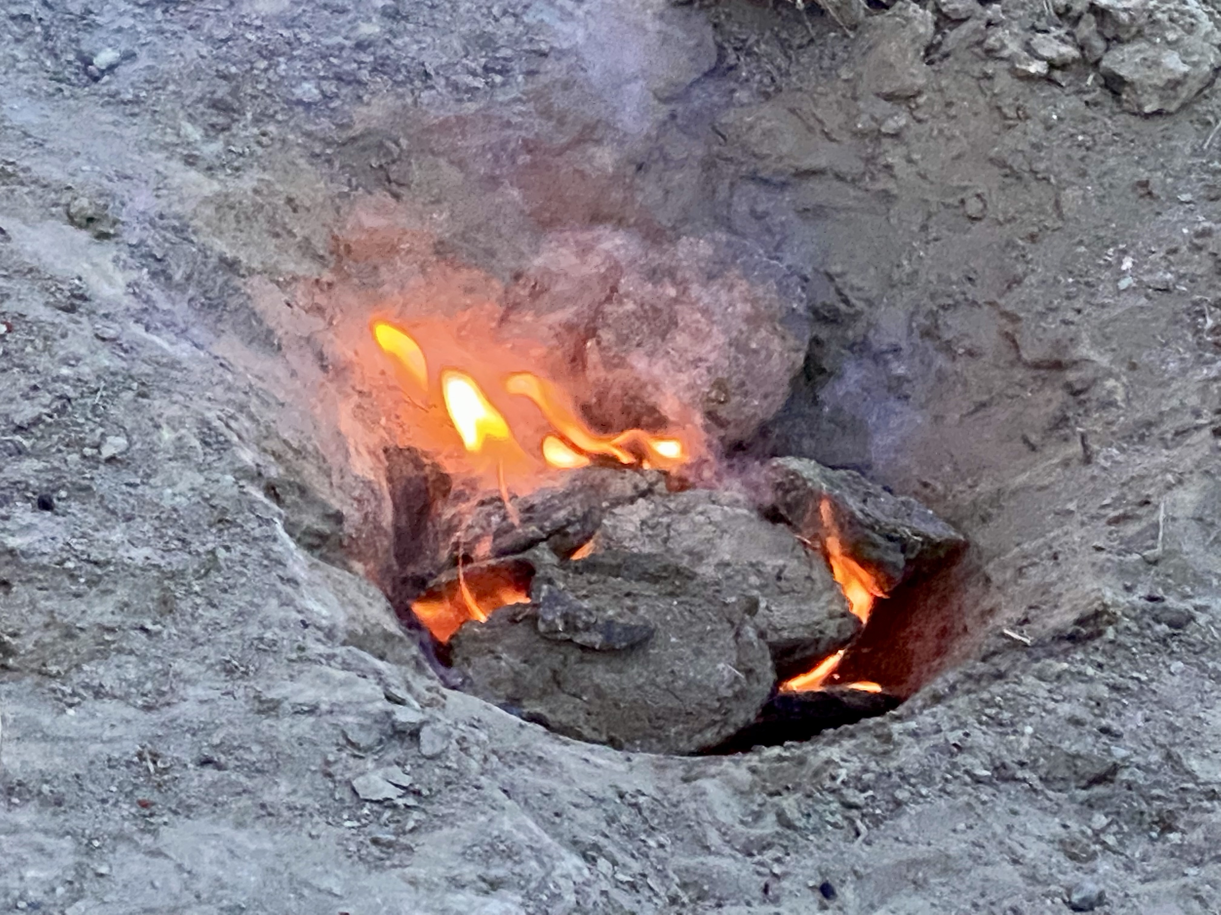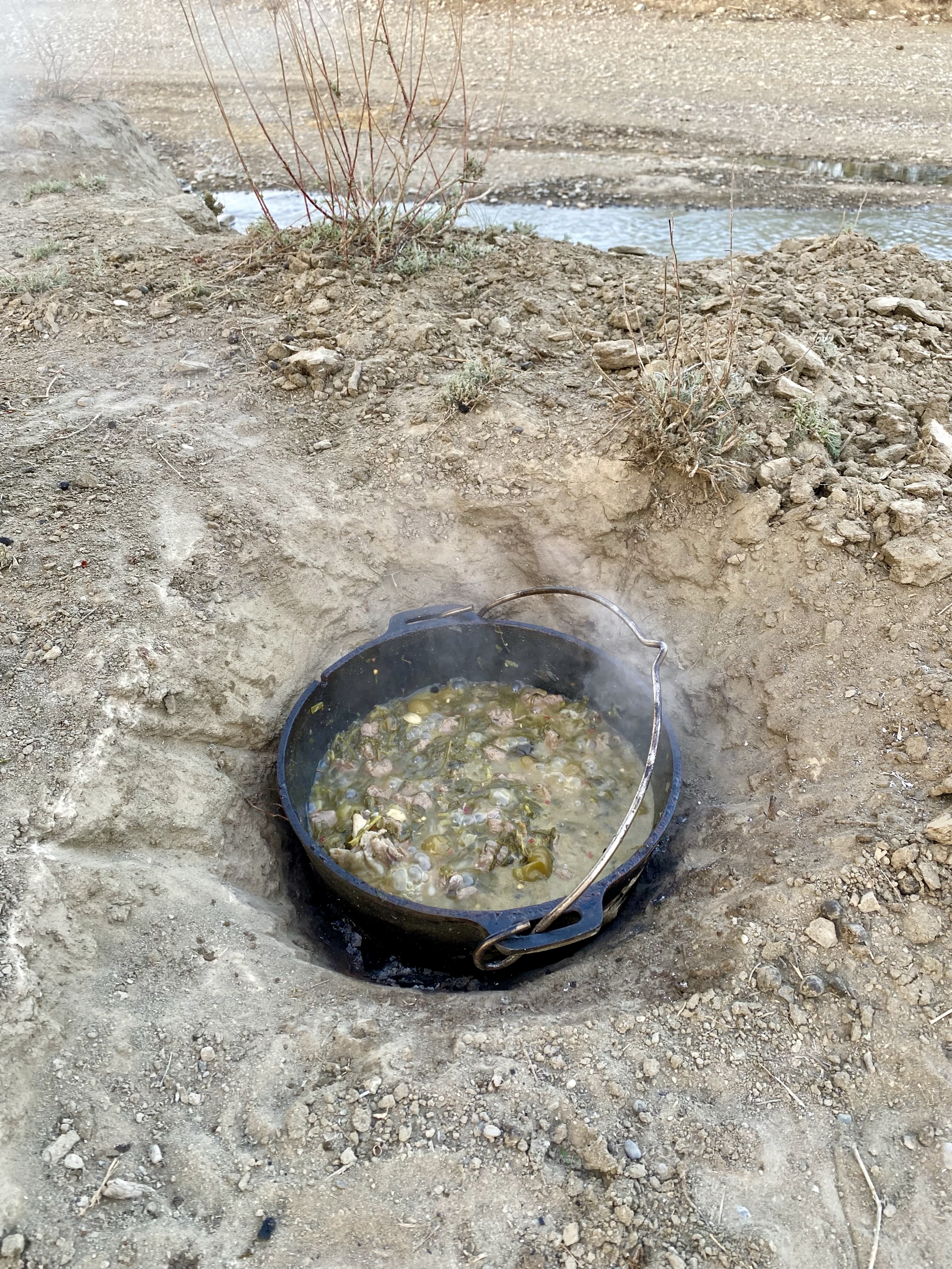 Am nächsten Tag finden wir einen lieben Schlafplatz an einem der Bacherl, lassen etwas die Seele baumeln und kochen den fantastischen Lammeintopf (Chakapuli) mit vielen frischen Kräutern (vorallem Estragon) nach. Am Abend ziehen unendliche Schafherden vorbei, so große haben wir noch nie gesehen. Ein richtiges Lagerfeuer trauen wir uns wegen der Trockenheit nicht zu machen, aber wir machen in der Feuertopfgrube ein Kuhfladen-Feuer. Drockene Fladen liegen hier zu Hunderten herum und brennen wirklich gut.
