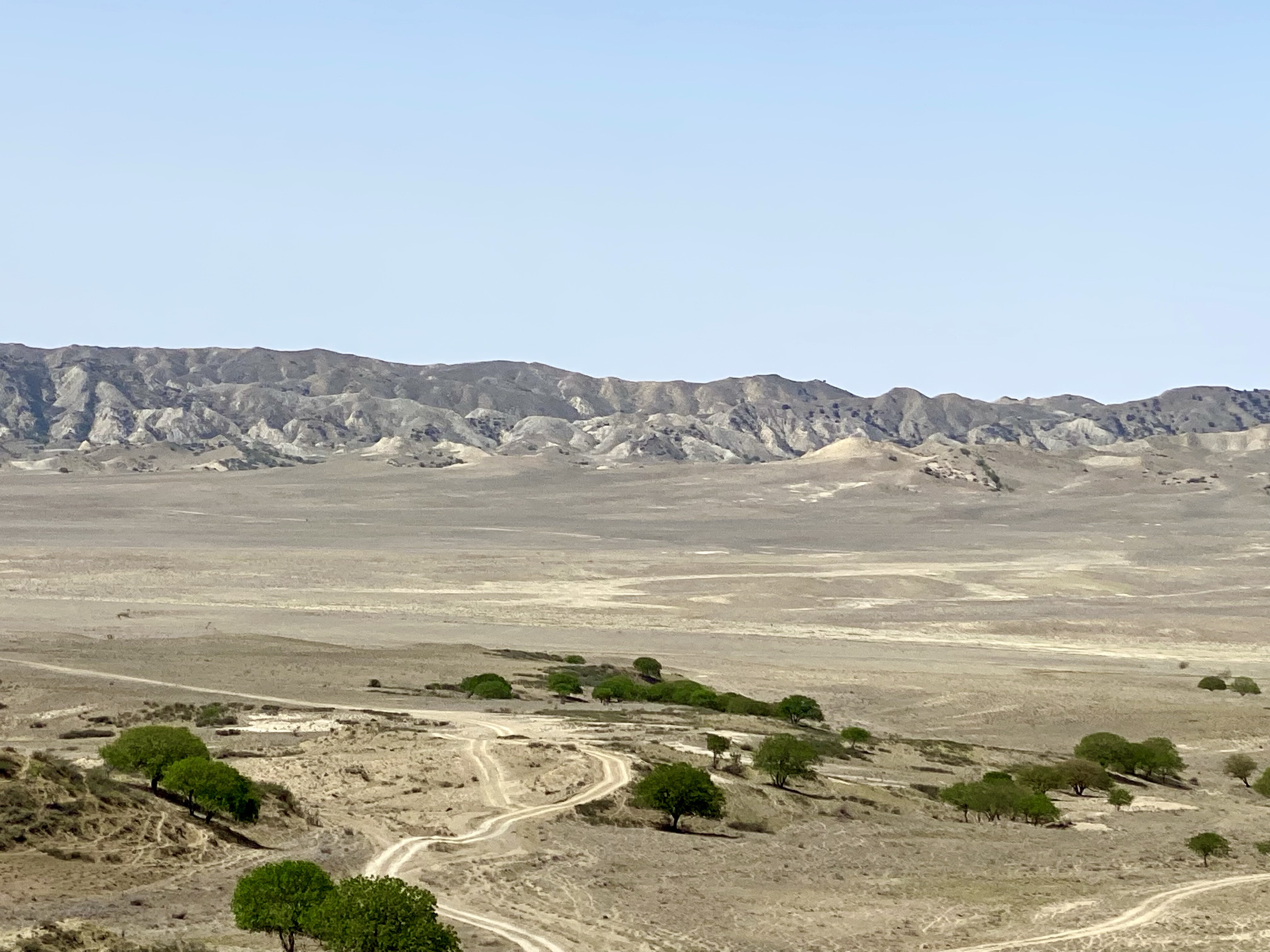 Nach dem Vorräte Auffüllen fahren wir zu den nahe gelegenen Schlammvulkanen.Die Landschaft ist anfangs malerisch, seltsame grüne Hügel erheben sich immer wieder, dann wird es wieder karger. Der Weg ist, obwohl als offiziell ausgeschilderter Weg zu einem „Hotel“, sowas von schlecht, dass wir für gute 30 km zweieinhalb Stunden brauchen. Das Hotel besteht übrigens aus einigen zum Teil bereits verfallenen Häuschen.