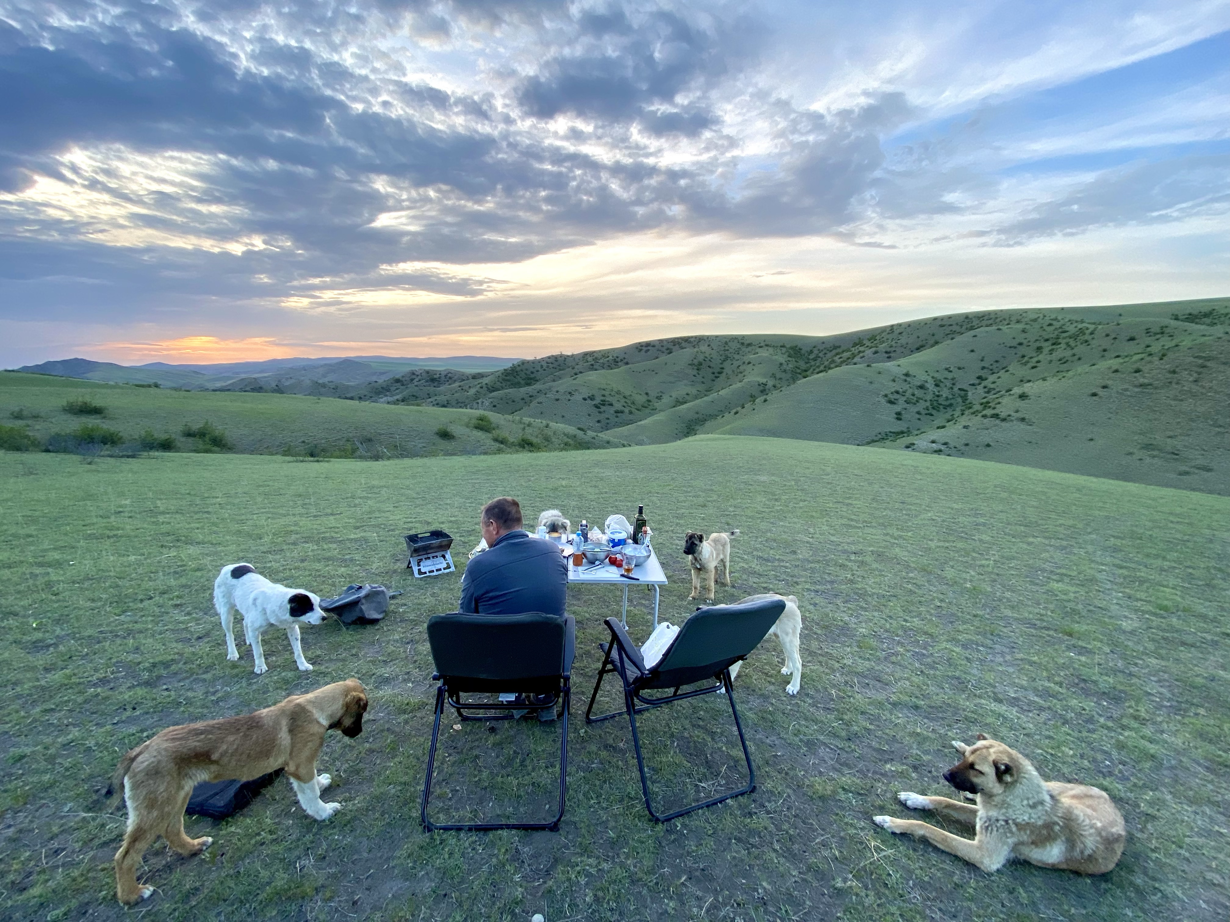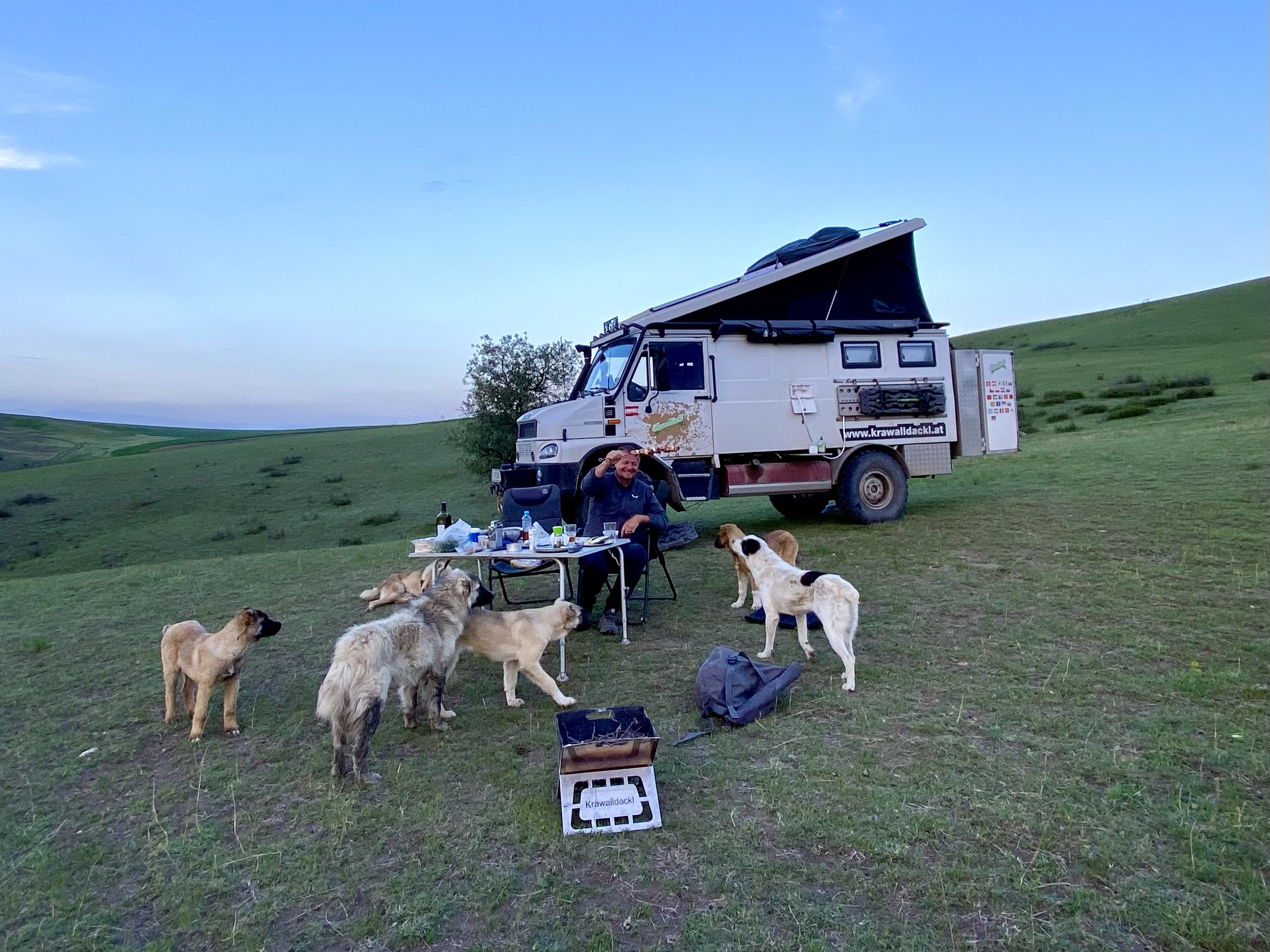 Am Schlafplatz, den wir auserkoren haben, kommt natürlich wieder eine Schafherde vorbei und schon sind wir von 6 Hunden umzingelt. Zum Glück freundliche Hunde und keine richtig bösen Herdenhunde. Sie fühlen sich recht wohl bei uns und 4 davon bleiben die ganze Nacht, um uns zu beschützen (könnte aber auch an den Fleischhäppchen liegen, die gelegentlich auf den Boden gefallen sind).