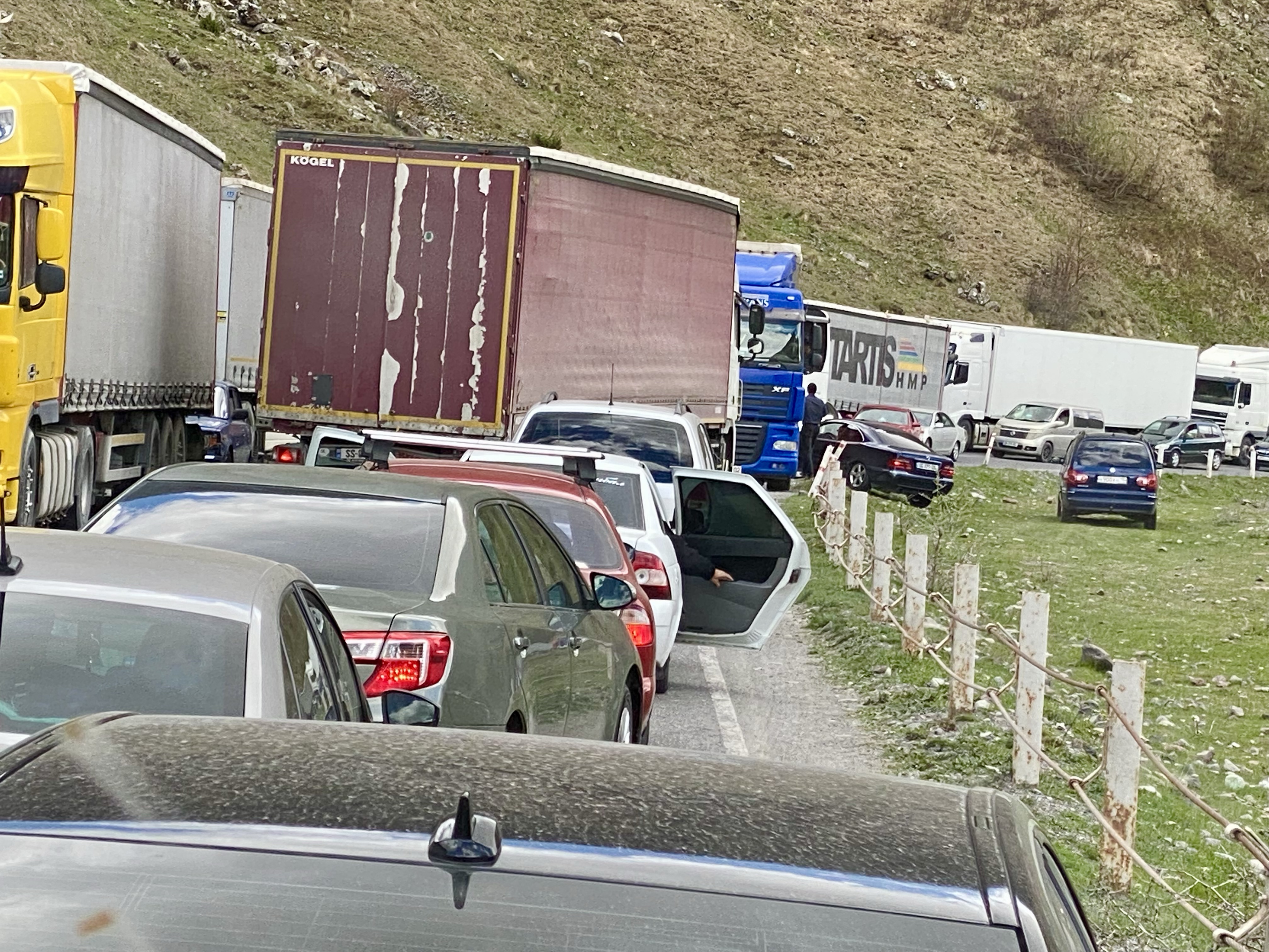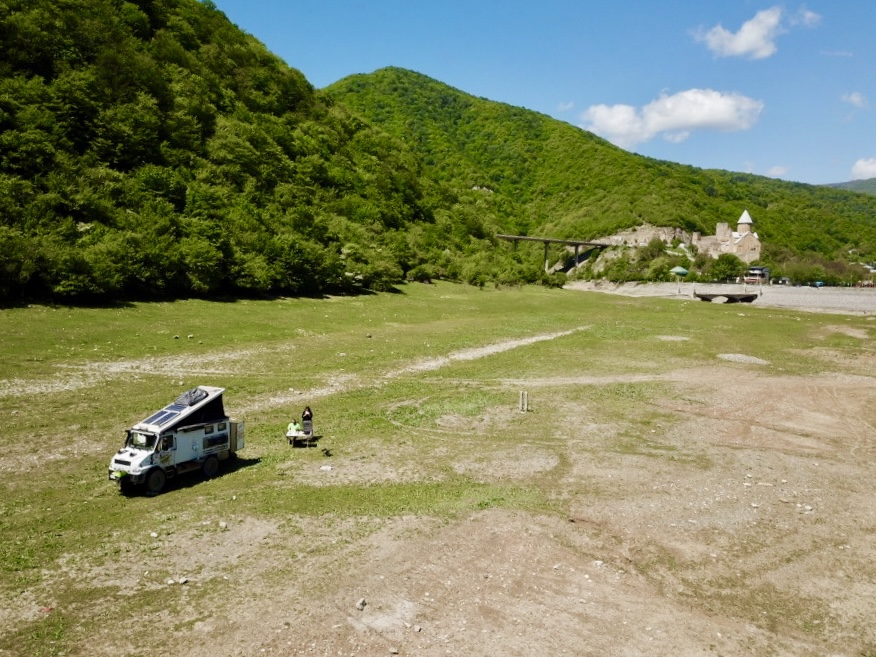 Wir übernachten am Aragvi Stausee unterhalb der Ananuri Festung. Schon am Weg dorthin stehen hunderte LKWs am Straßenrand und warten, bis sie weiterfahren dürfen.