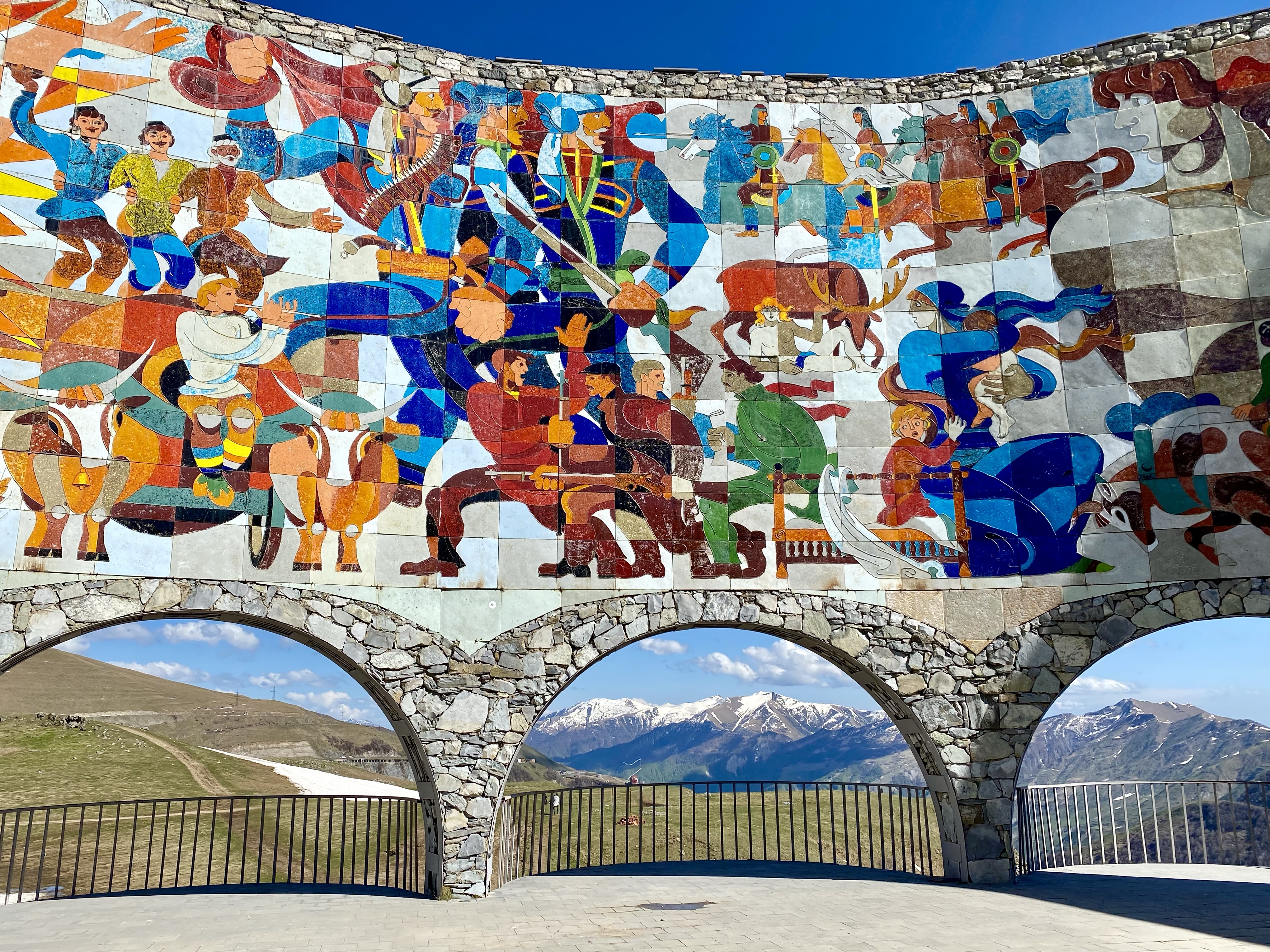 Gleich nach Gudauri, kurz vor dem Kreuzpass, befindet sich eine große Aussichtsplattform, die einen schönen Rundumblick auf die wunderbare Bergkulisse des großen Kaukasus bietet.