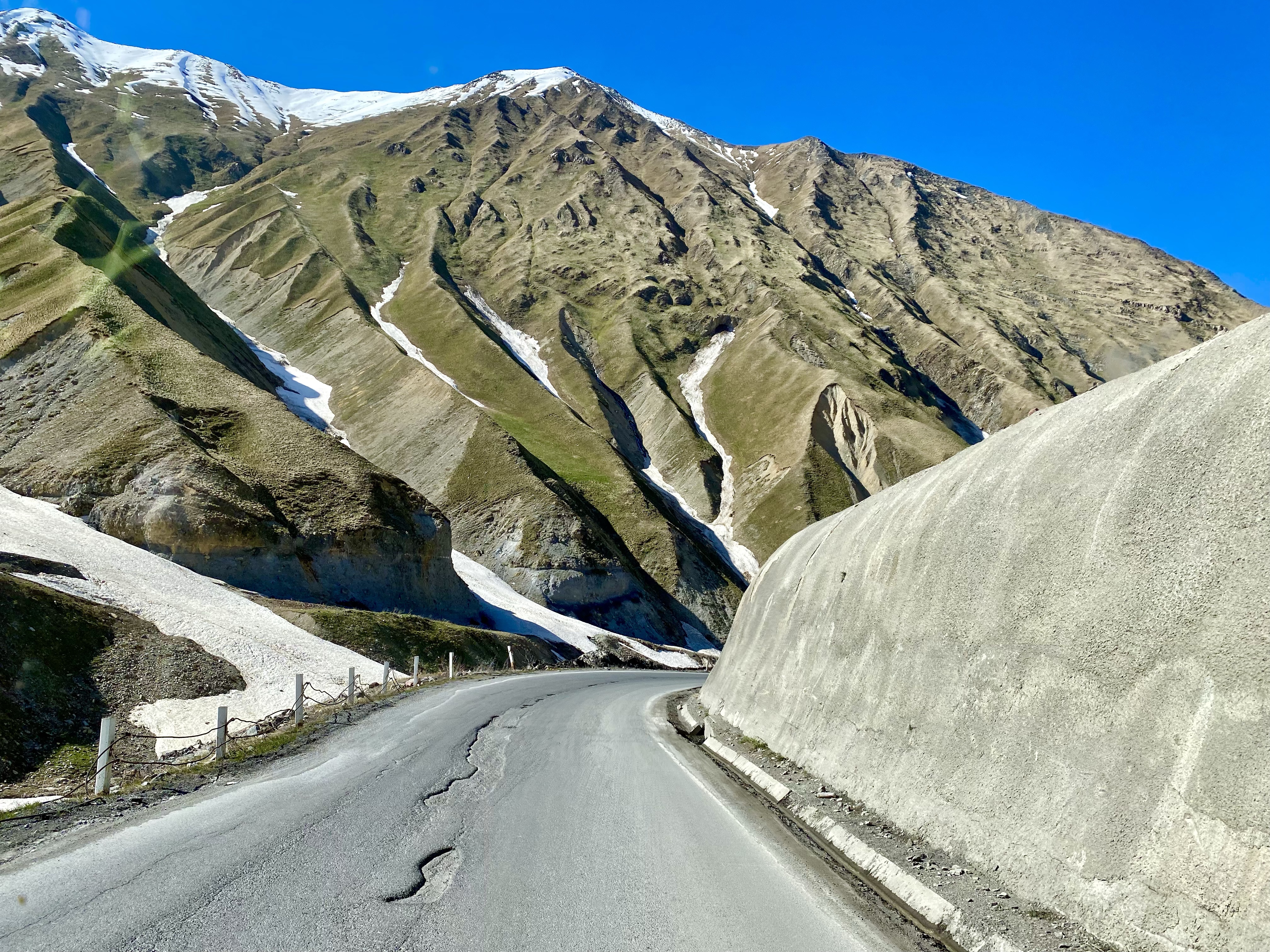 Die Heerstraße ist die einzige Verbindung zw. Russland und Georgien und ist daher die Fernstraße auf der sich der gesamte LKW Verkehr abspielt. Sie durchquert den großen Kaukasus und erreicht am Kreuzpass eine Höhe von 2382 m.