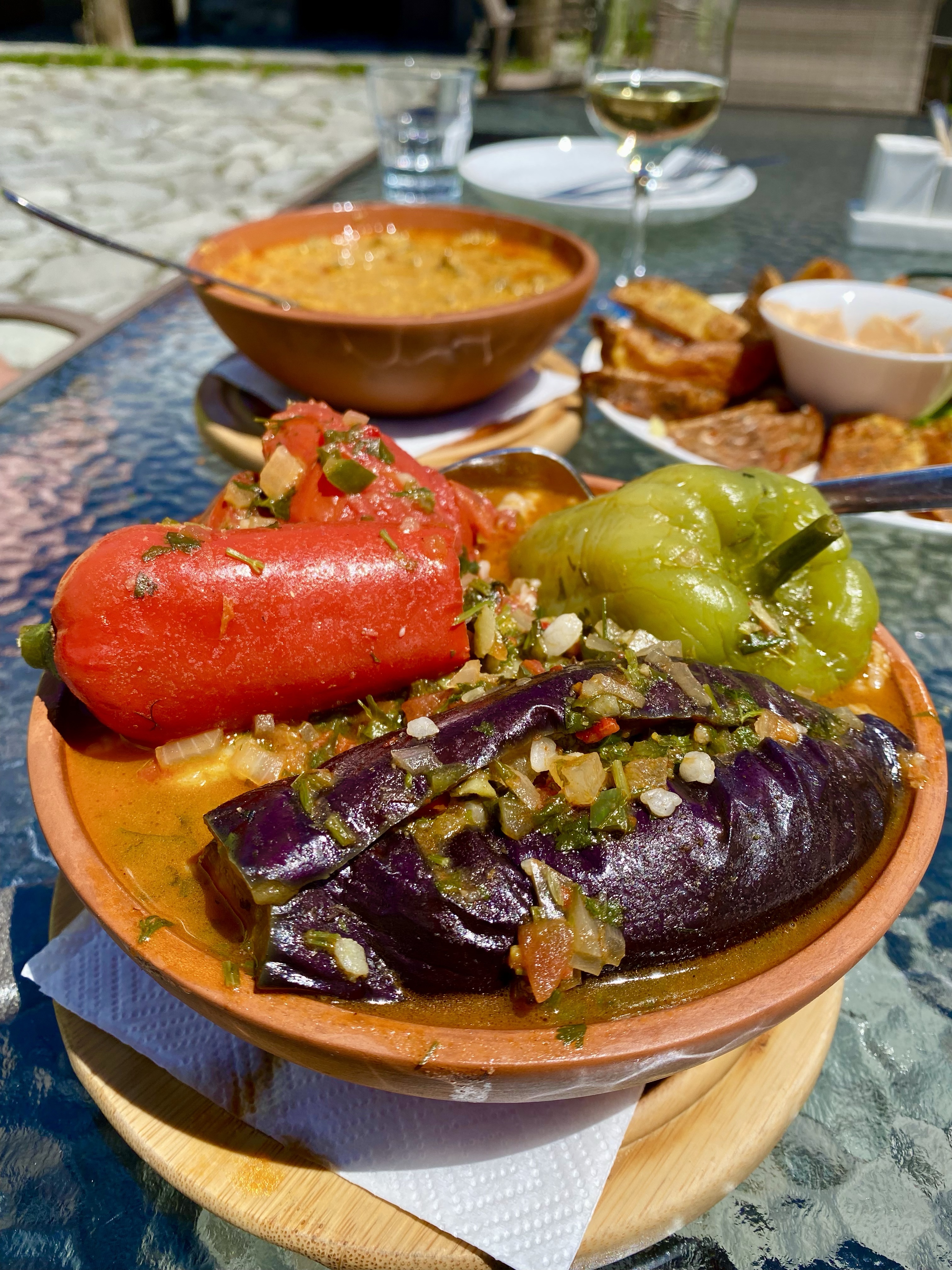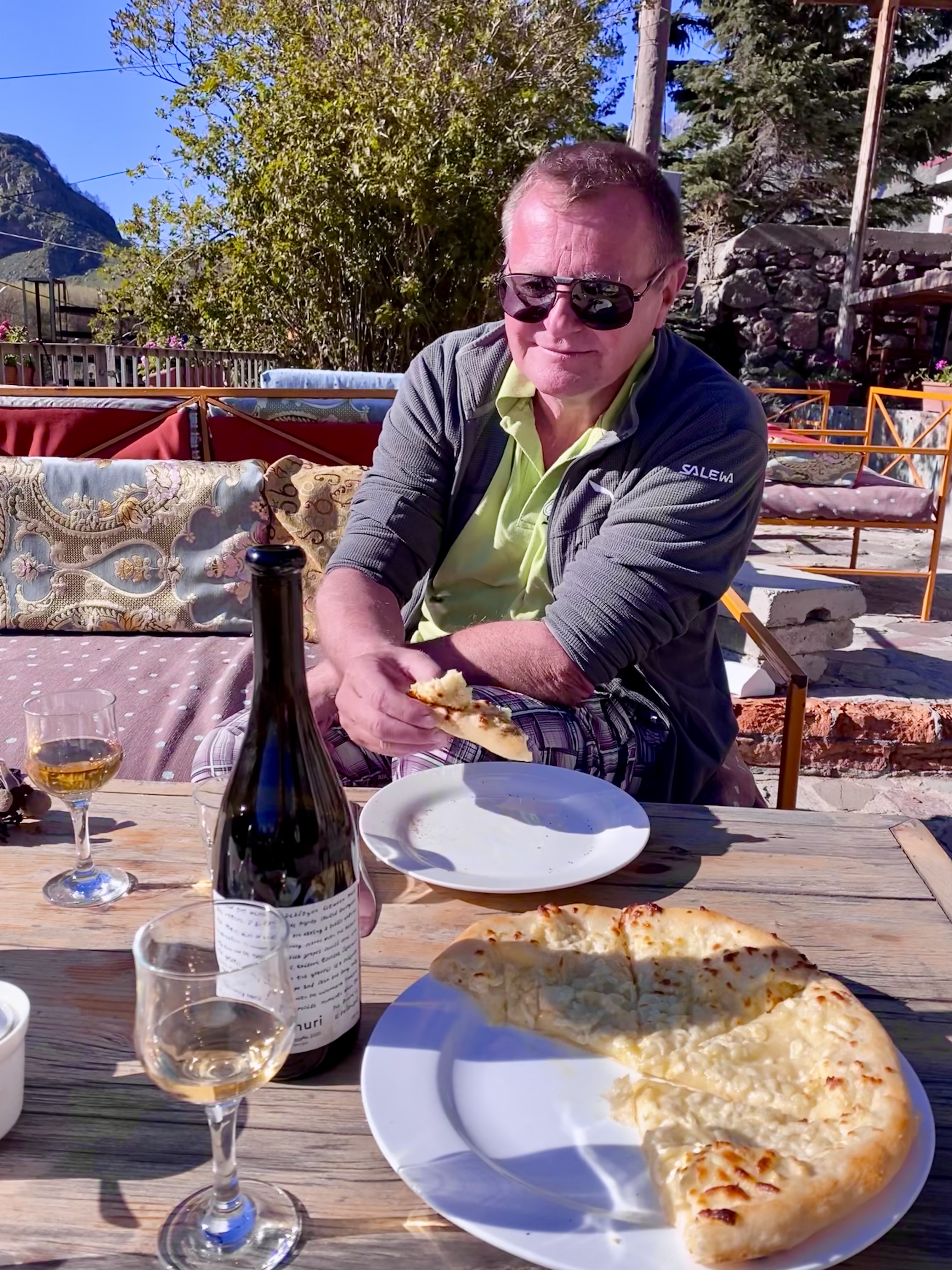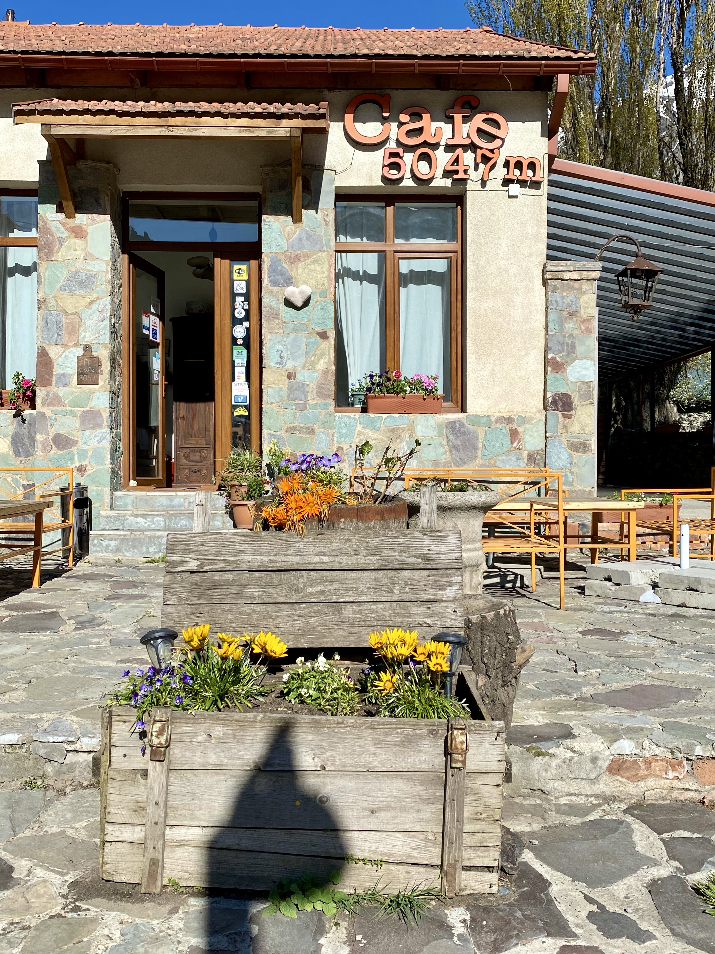In Stepantsminda finden wir ein chilliges Lokal mit Blick auf den 5.047m hohen Kasbek und die Dreifsltigkeitskirche aus dem 14. Jahrhundert.
