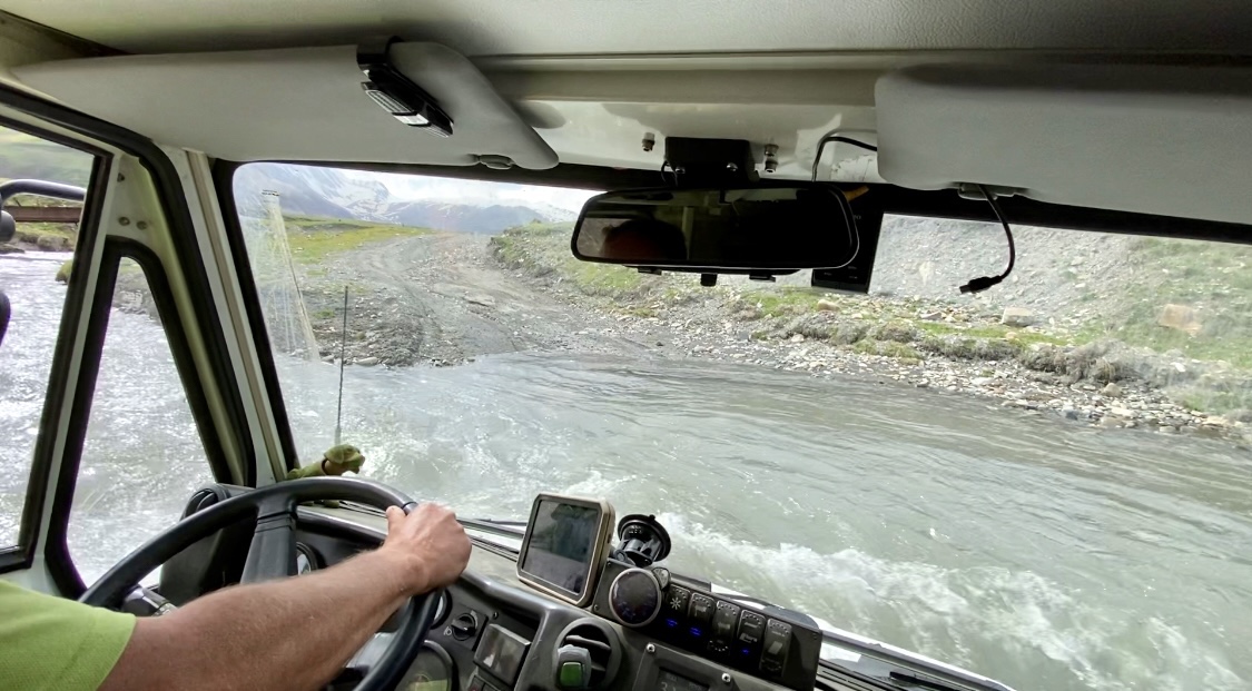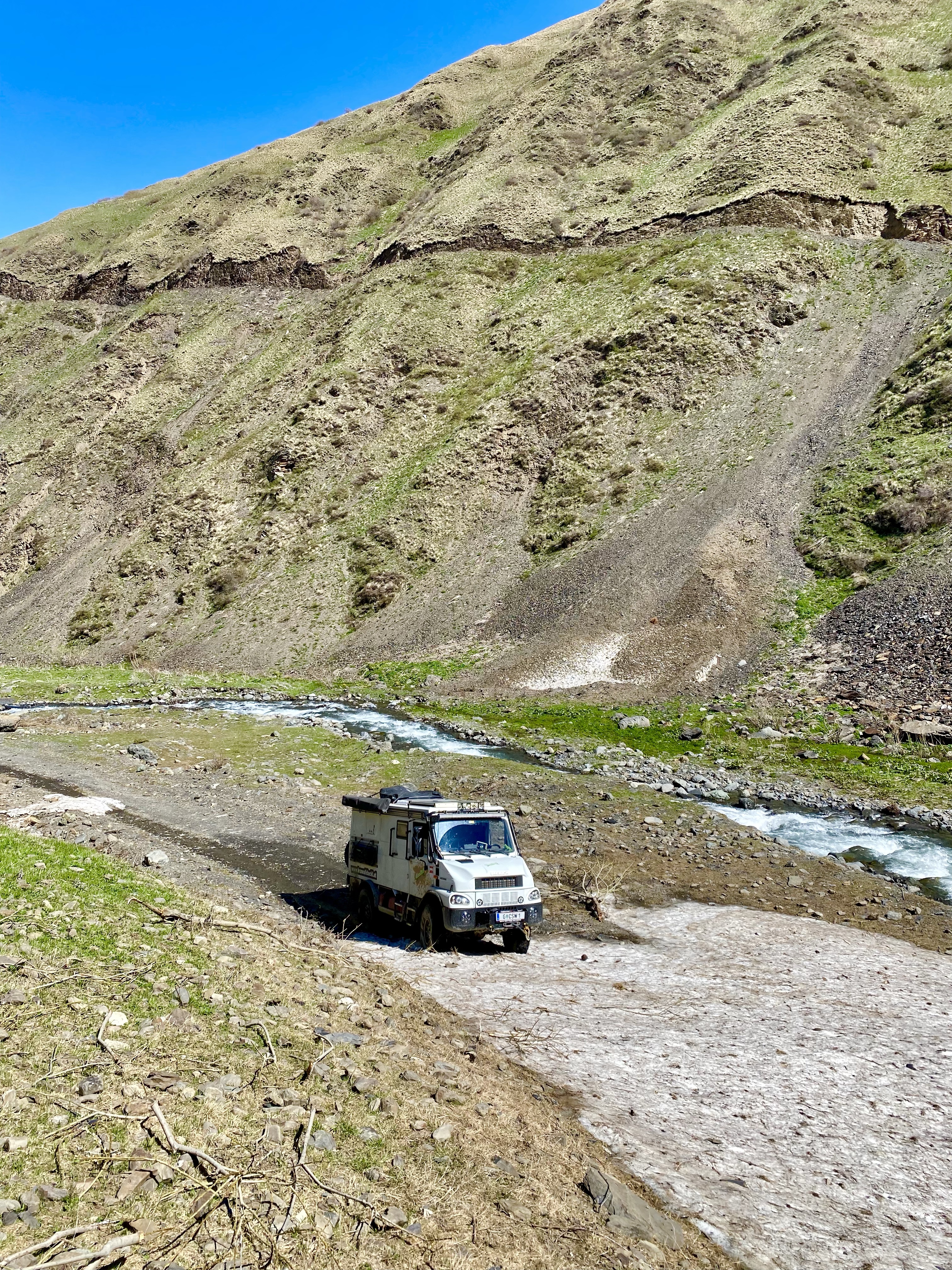 Wir hatten wohl noch nicht genügend Wasserdurchfahrten, denn Christan muss trotzdem noch unbedingt einmal durch den Fluß fahren, obwohl das gar nicht mehr nötig gewesen wäre. Anfangs schaut das alles noch recht harmlos aus, doch dann wird es plötzlich tief! Wir sinken mit der Schnauze des Bremi so richtig ab und man kann die starke Strömung des Terek spüren. Ich halte wieder mal die Luft an. Als wir am anderen Ufer sind schauen wir die Brücke an. Über die können wir auf keinen Fall fahren, die schaut nicht so aus, als würde sie dem Gewicht des Bremi standhalten. Also zurück auf dem selben Weg…