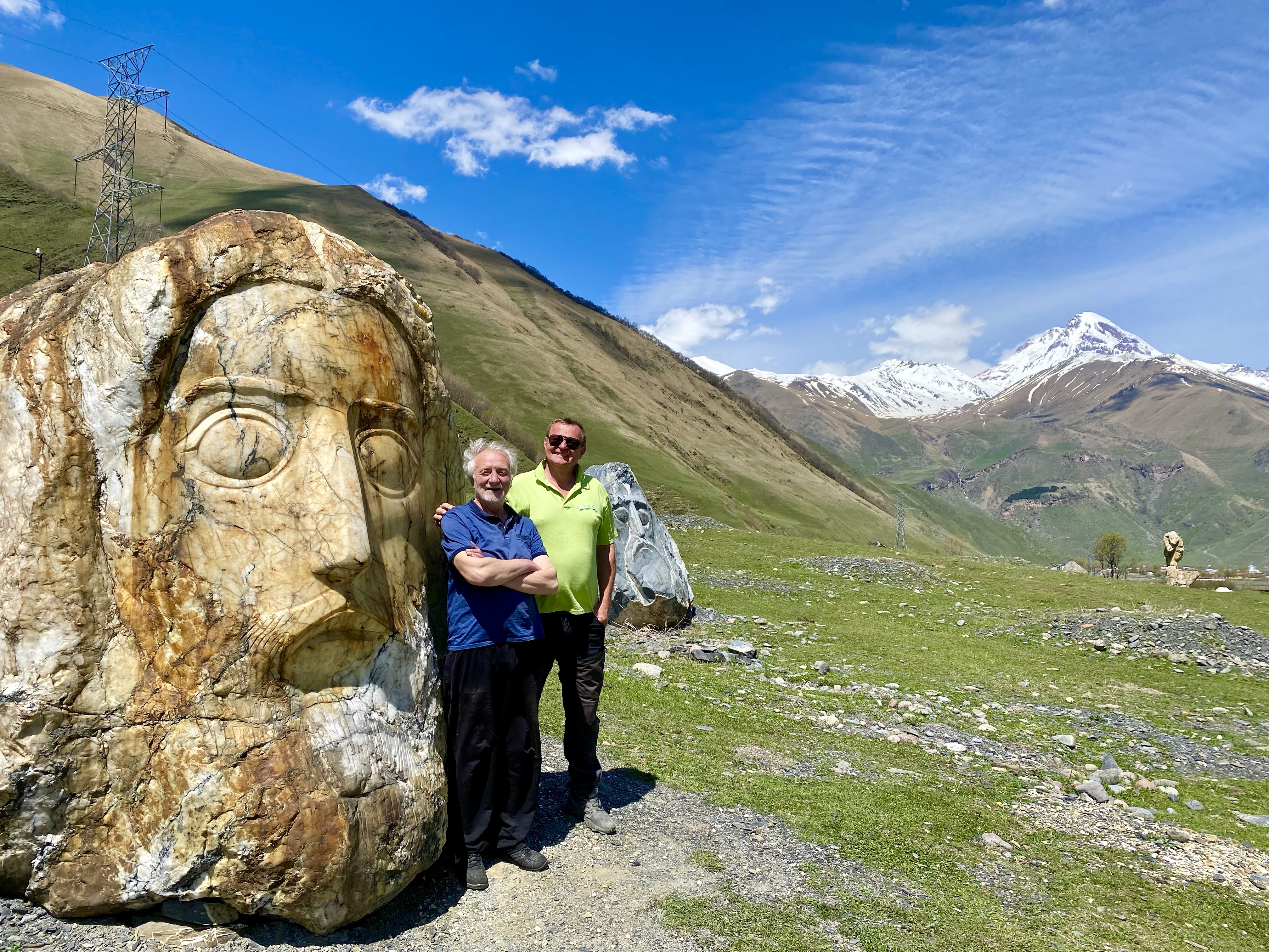Am Rückweg durchs Sno – Tal machen wir Halt bei den Gesichtern aus Stein. Ein lokaler Künstler hat auf der Wiese vor dem Dorf große Felsbrocken aufgestellt und ihnen Gesichter von georgischen Dichtern und religiöser Figuren gegeben. Wir haben Glück, er kommt gerade mit seiner Flex in der Hand, als wir Fotos machen. So können wir ein paar Worte mit ihm wechseln.