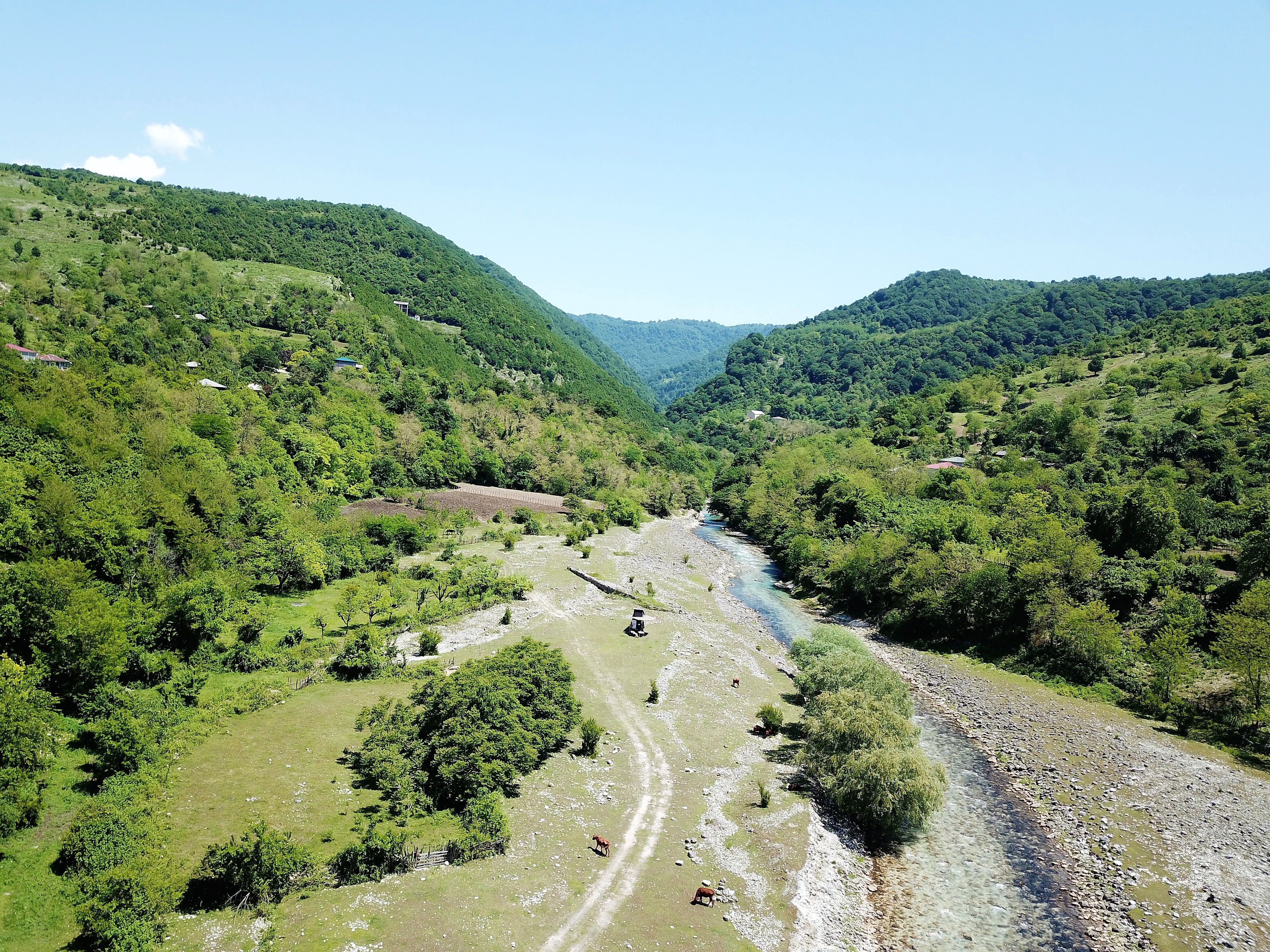 Wir wollen von Gori nach Oni zum Rioni River fahren. Blöderweise sind in der Karte in dem Navigationsprogramm, das ich verwende, die beiden abtrünnigen, pro-russischen Gebiete innerhalb Georgiens nicht eingezeichnet. Ich komme natürlich nicht auf die Idee in einer anderen Karte nachzuschauen, ob wir den ausgesuchten Weg nehmen können, obwohl mich Christian eh sogar noch danach fragt. Dummer Fehler, denn mitten im Ort Ergneti stehen wir auf einmal vor einem mit Stacheldraht doppelt und dreifach gesicherten Militärcamp und werden von Polizisten gestoppt. Wir stehen vor Südossetien und können nicht durch. Aber nicht dass es davor auf der Straße irgendwelche Hinweise auf diese Grenze gegeben hätte. Ganz normale Wegweiser gibt es, die den Weg dorthin weisen, wo man nicht hin kann. Also heißt es wieder mal umdrehen! Es ist Nachmittag und wir wollen nicht mehr weit fahren, daher beschließen wir gleich hier am großen Liakhavi einen Schlafplatz zu suchen.