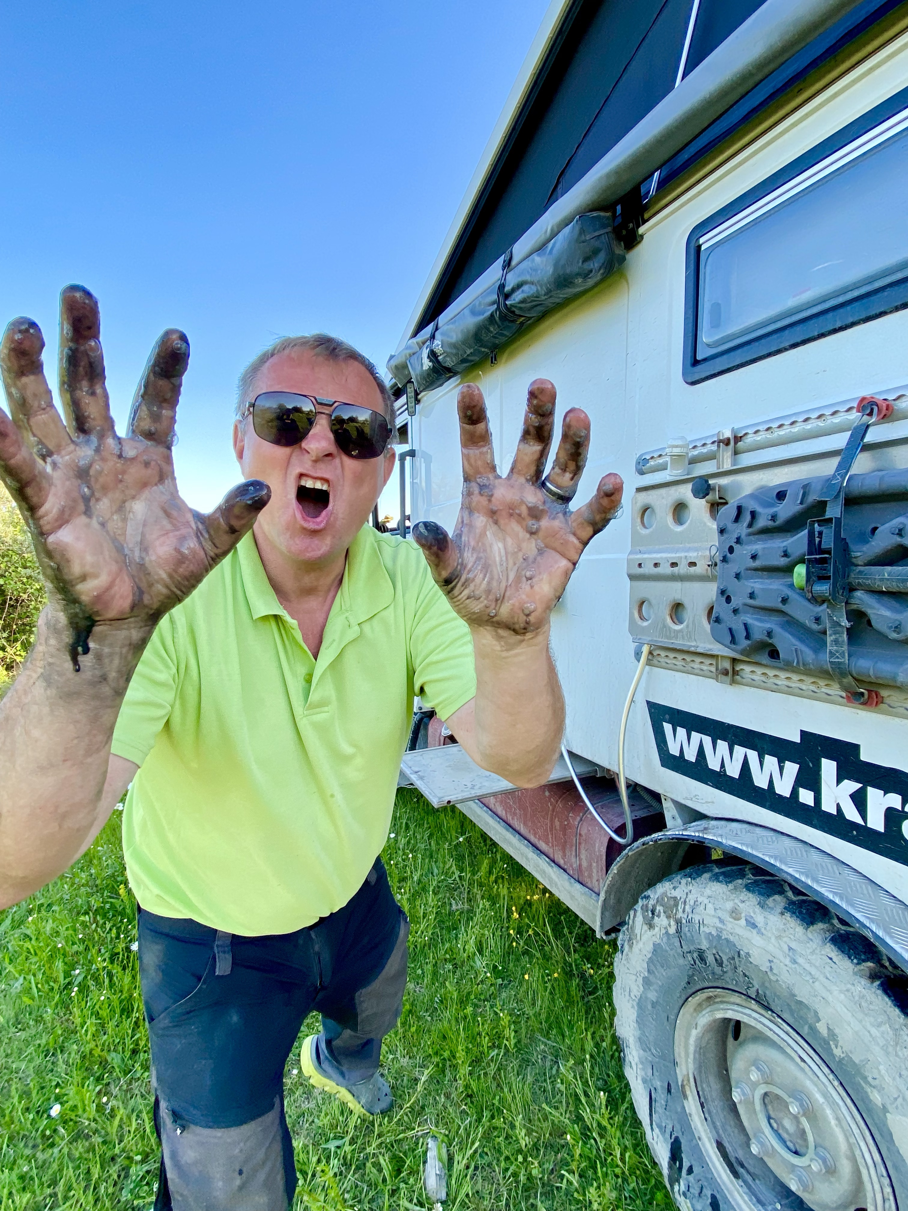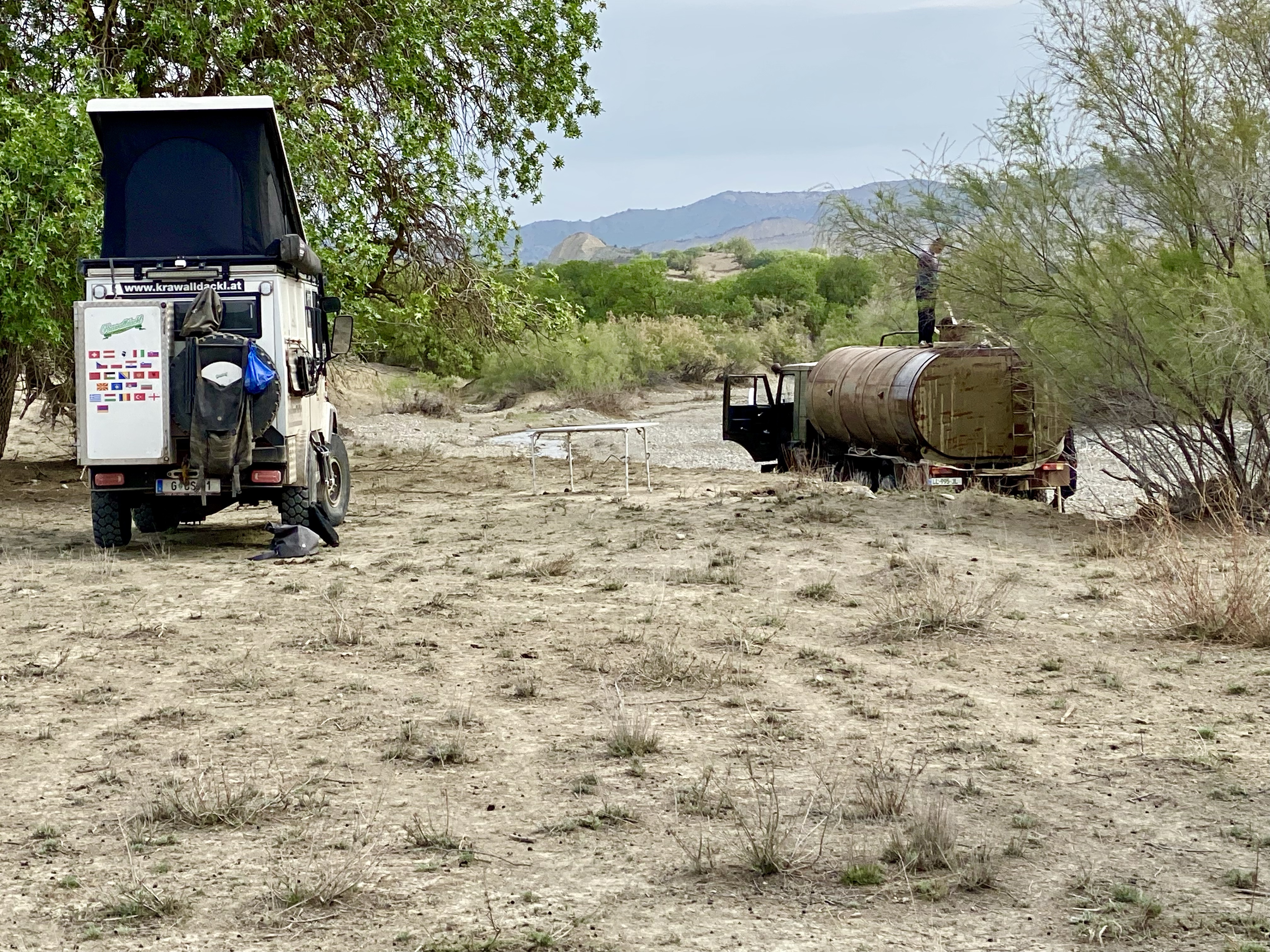 Dann gibt’s auch noch so das eine oder andere Problem beim Auto: Das Strompanel zickt, die Wasserpumpe fällt aus (kein Duschen und Abwaschen mehr möglich), die Schrauben vom Solarpanel lockern sich durch das ewige Gerüttel, die Schraube von der Stoßdämpferhalterung ist gebrochen, der Kompressor ist abgebrannt (doof, weil die laute Hupe dranhängt und es vorbei ist mit unabhängiger Reifendruck-Regulation), Wasser im Dieselfilter, das 3x abgelassen werden muss, Motoraussetzer wohl auch durch den schlechten Treibstoff verursacht. Ächzende Blattfedern – kein Wunder…