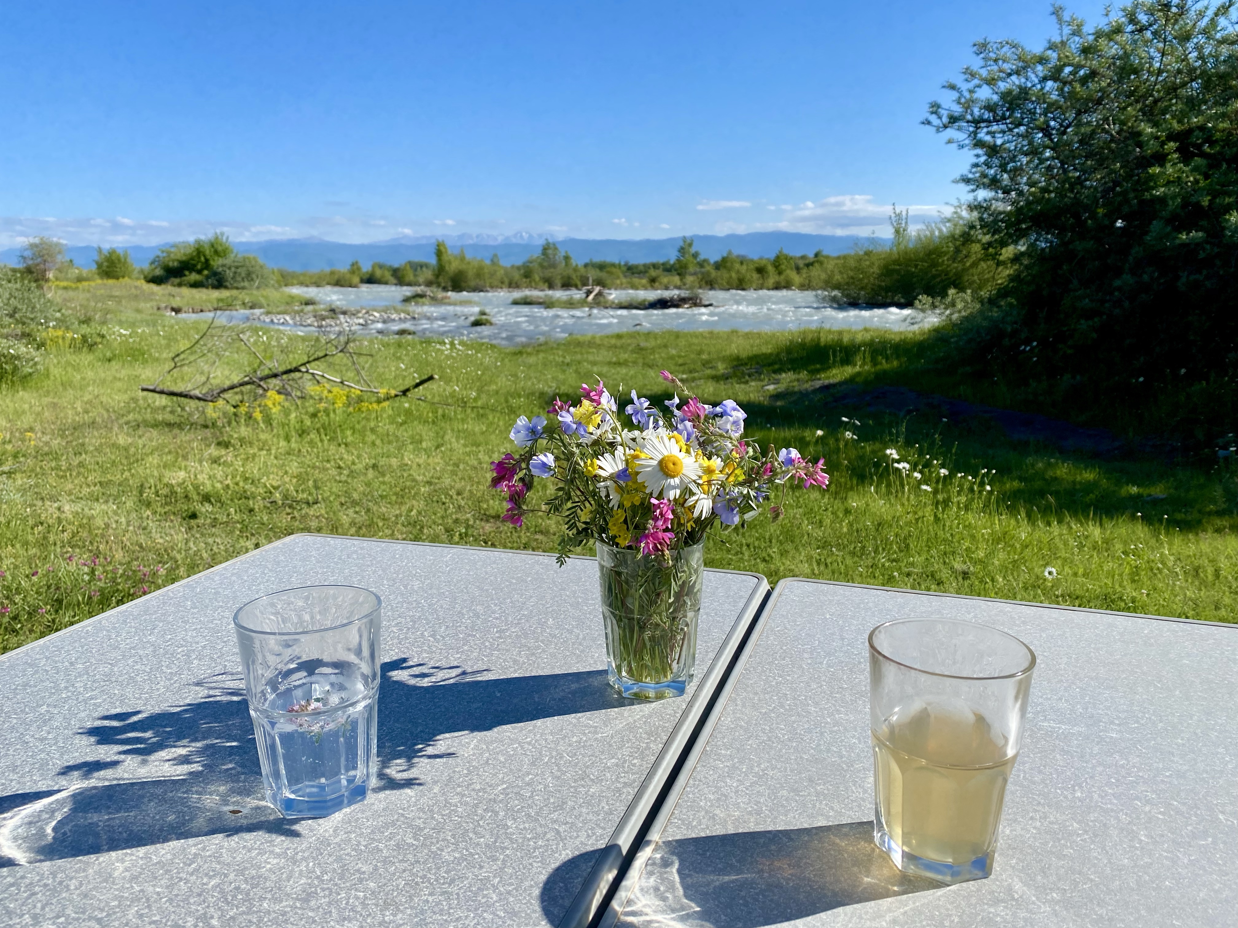 Der Platz am Fluss, der quasi uns gefunden hat, gefällt uns so gut, dass wir gleich 3 Nächte bleiben. Ein Kuhhirte sieht uns und bringt uns eine 2 Liter Flasche selbst gemachten Rotwein vorbei. Am nächsten Abend haben wir bereits Besuch von der gesamten Dorfprominenz. Wir bekommen wieder Wein in Hülle und Fülle, Chacha, Äpfel und Weintrauben geschenkt.
