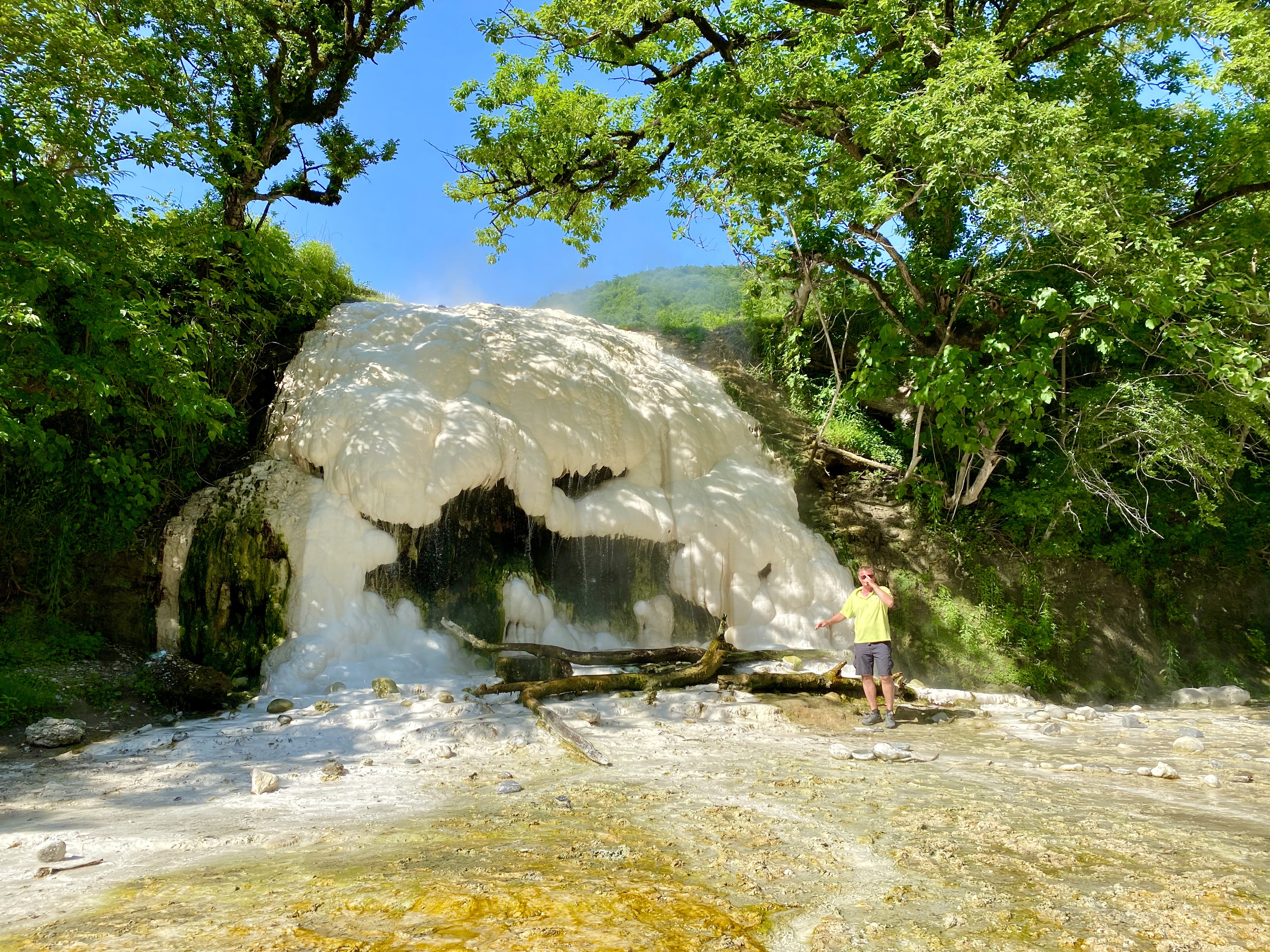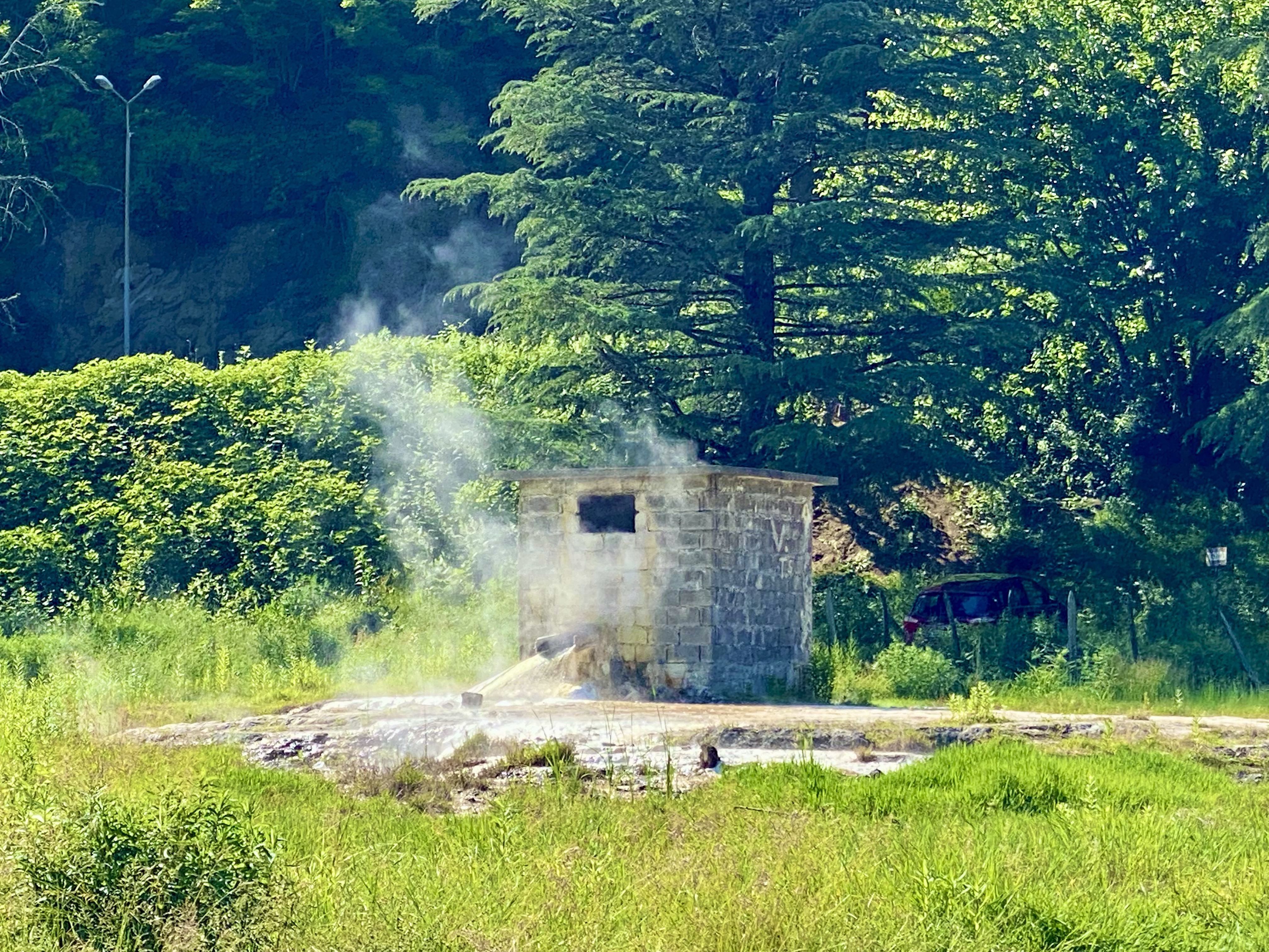 „The white cascade“- mehrere schwefelhaltige Mineralquellen oberhalb des Thekuri Flusses (die Quellen sind in Häuschen gefasst) ergießen sich in einem durch die Mineralablagerungen weißen Wasserfall in das Flussbett. Das Wasser der Quellen ist sehr heiß und stinkt gewaltig.