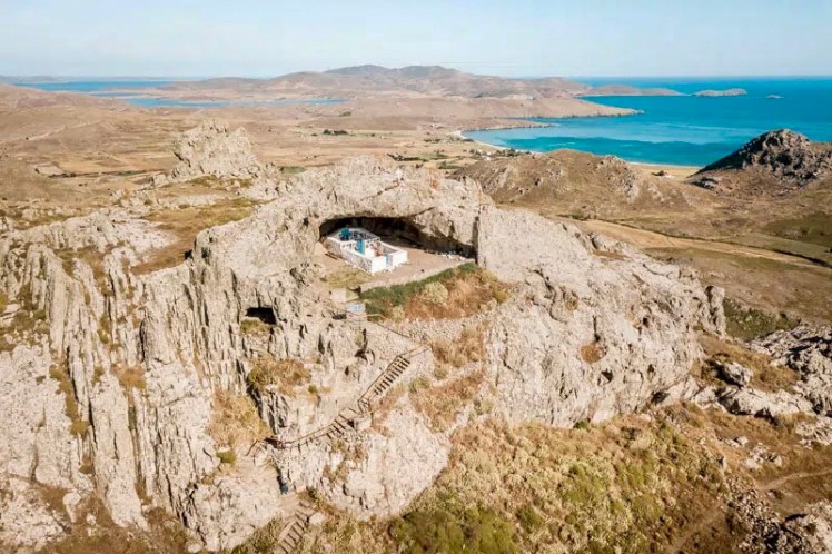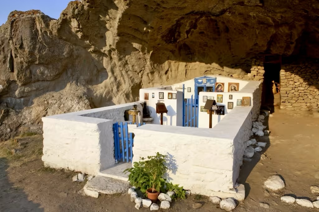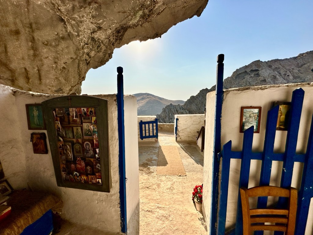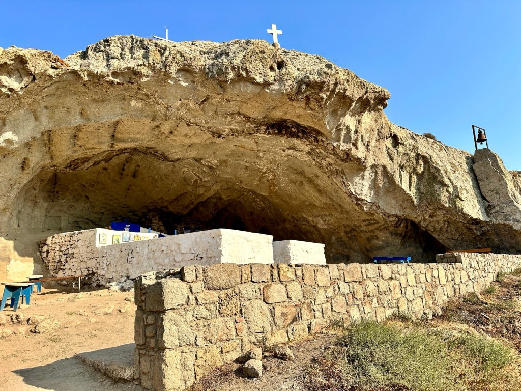 Eine kurze Wanderung bringt uns zur versteckten Höhlenkirche Panagia Kakaviotissa. Sie wurde 1416 gegründet und so gebaut, dass sie vom Meer nicht einsehbar war und als Schutz vor Angreifern diente. Allein schon die kurze Wanderung hinauf ist ein Highlight durch Felsformationen und mit toller Aussicht. Die Kirche sieht man erst ganz zum Schluß, wenn man die letzten Stufen erklommen hat. Man kann sie vorher nur durch ein kleines Kreuz am Felsen erahnen.