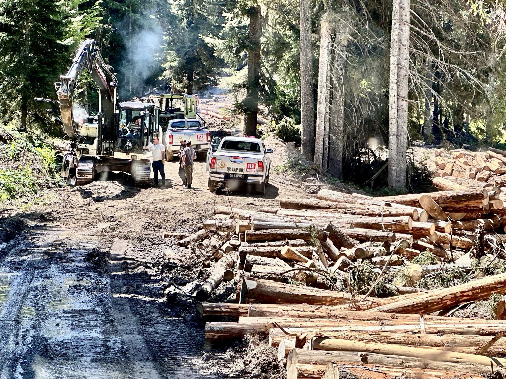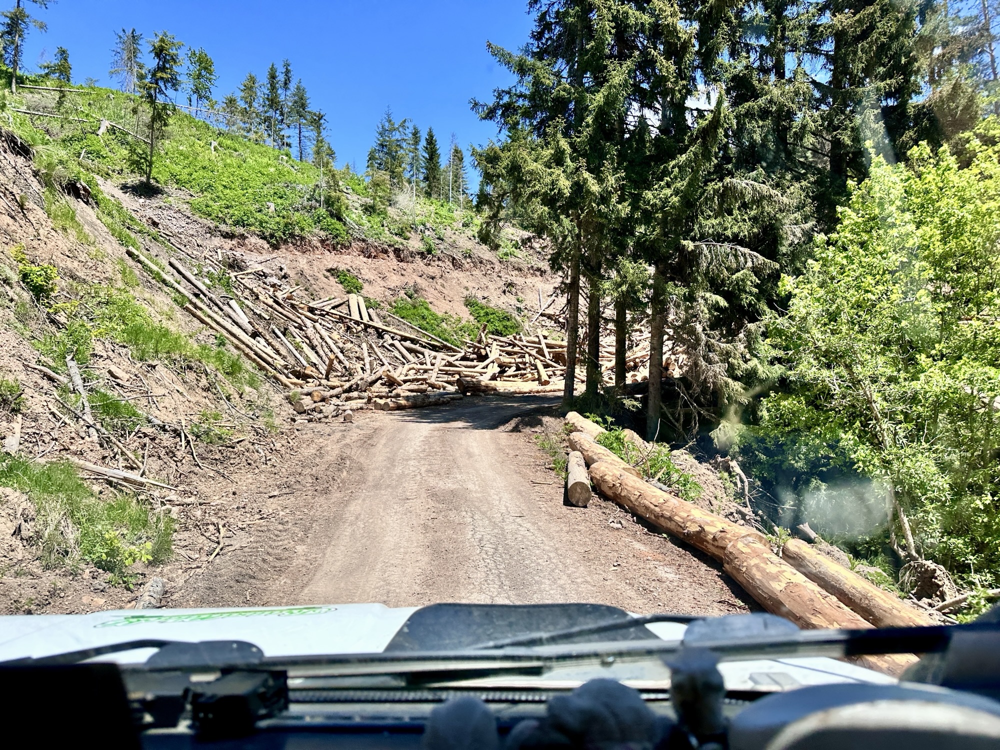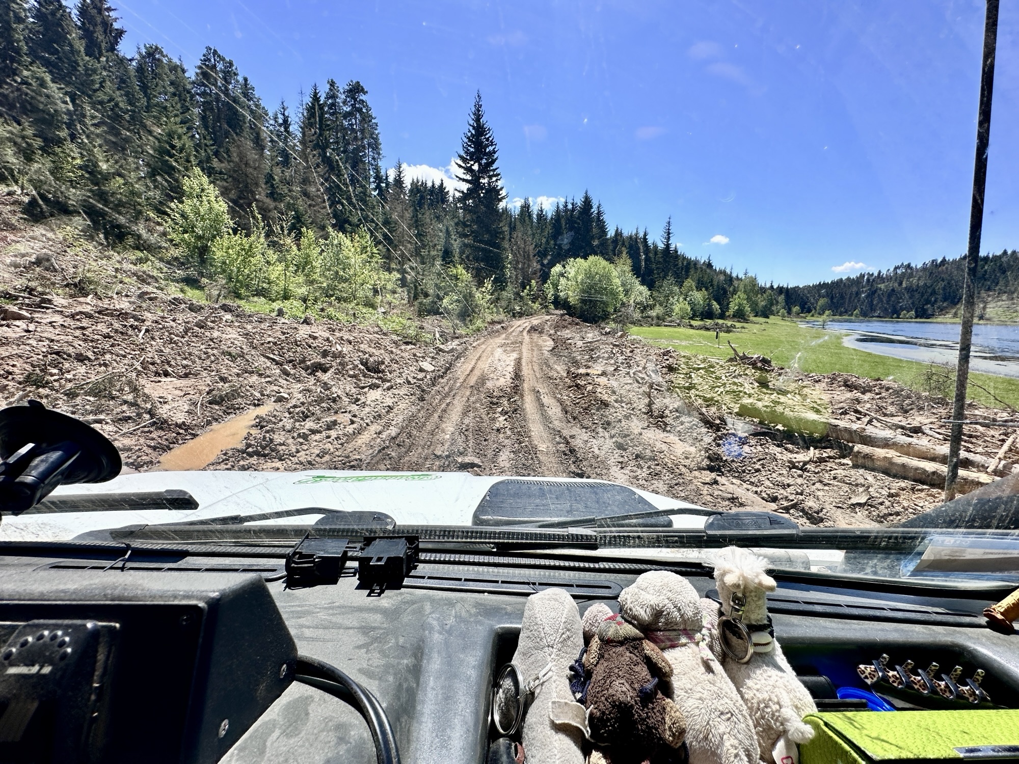 Der See ist sehr lieb gelegen, aber nichts für uns zum Bleiben. Wir sehen auf der Karte gleich in der Nähe einen zweiten See, aber keinen Weg hin. Am Satellitenbild ist aber deutlich ein Weg zu sehen. Also probieren wir unser Glück. Der Weg ist einfach mit der Schubraupe ausgeschoben und zeitweise etwas gatschig. Unten angekommen sehen wir schon ein großes Schild und Baracken, die auf Holzarbeiten hindeuten. Wir fahren weiter den See entlang, auf die freie Fläche zu, die wir am Satellitenbild als möglichen Stellplatz identifiziert haben. Leider werden wir genau dort von den Holzarbeitern gestoppt.