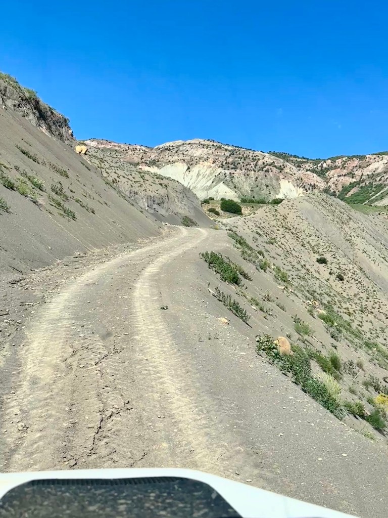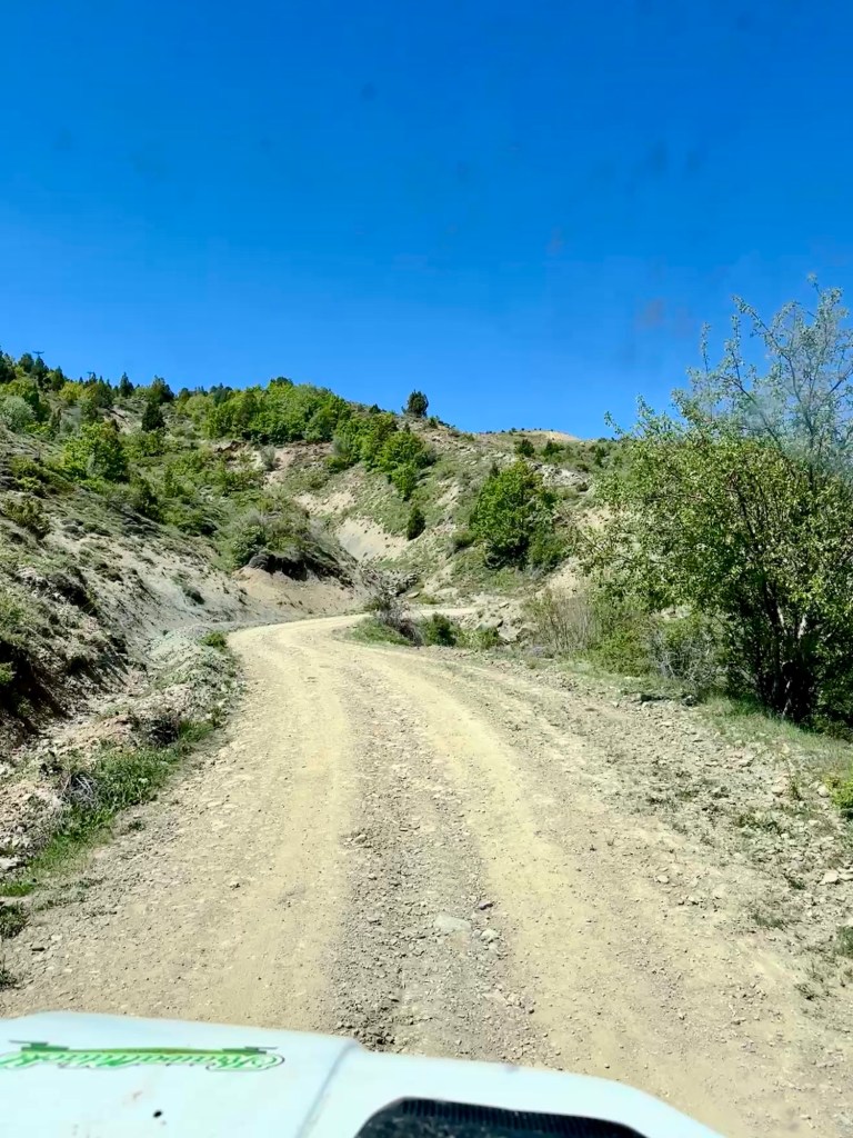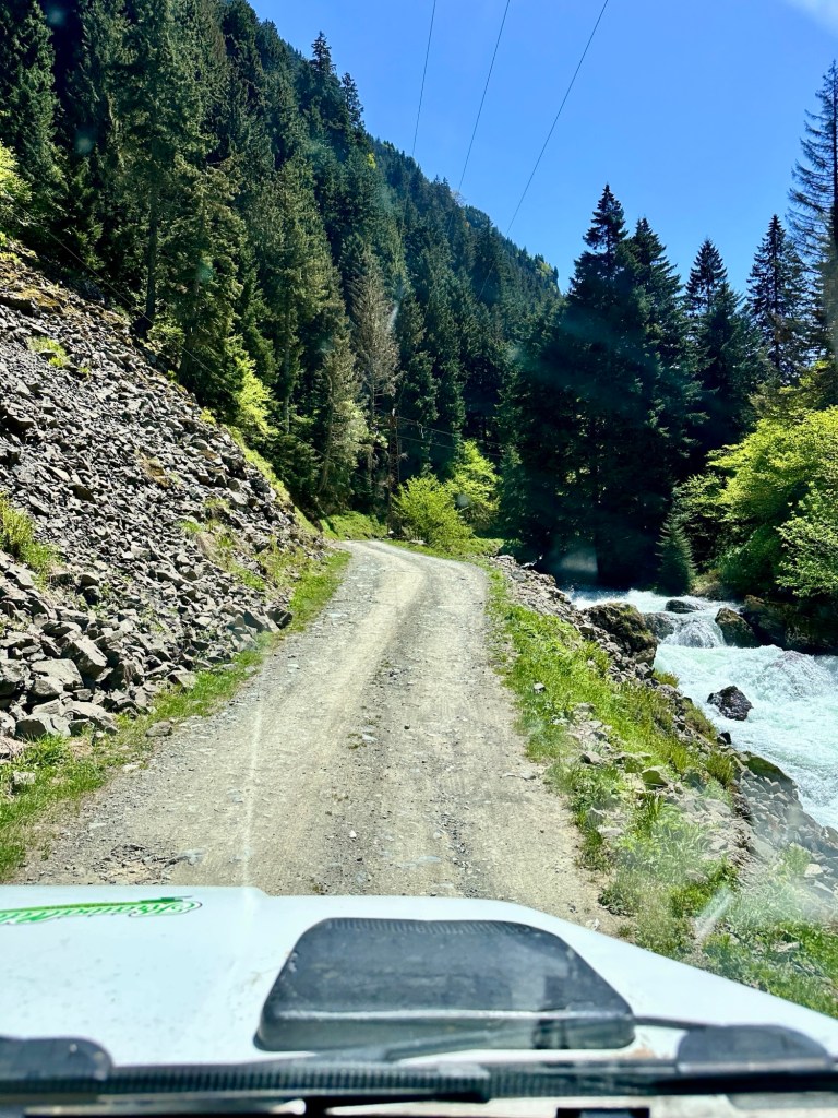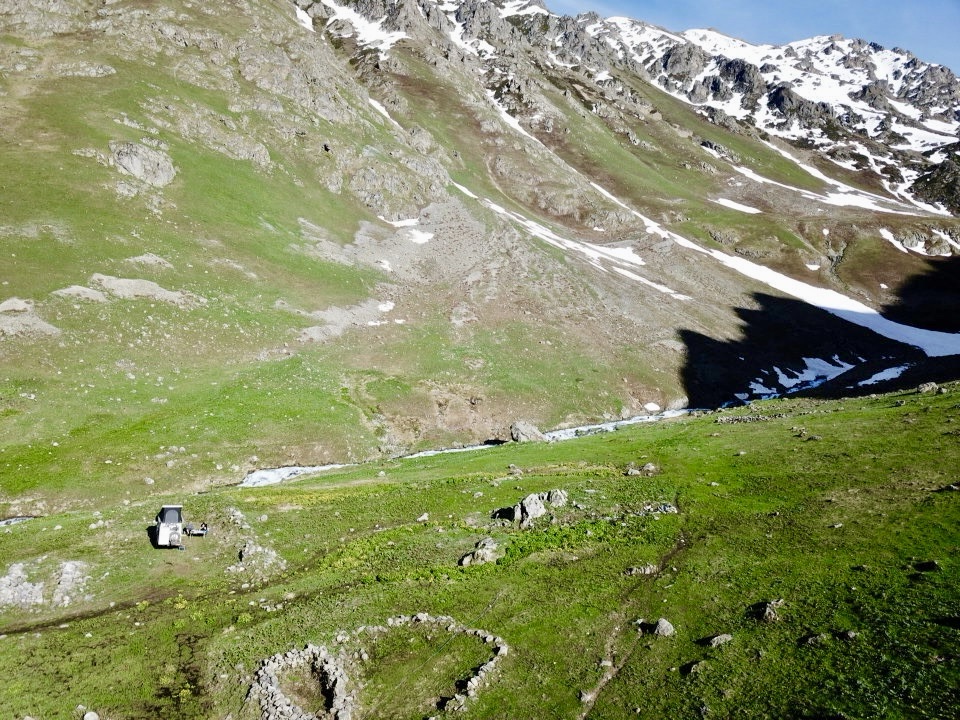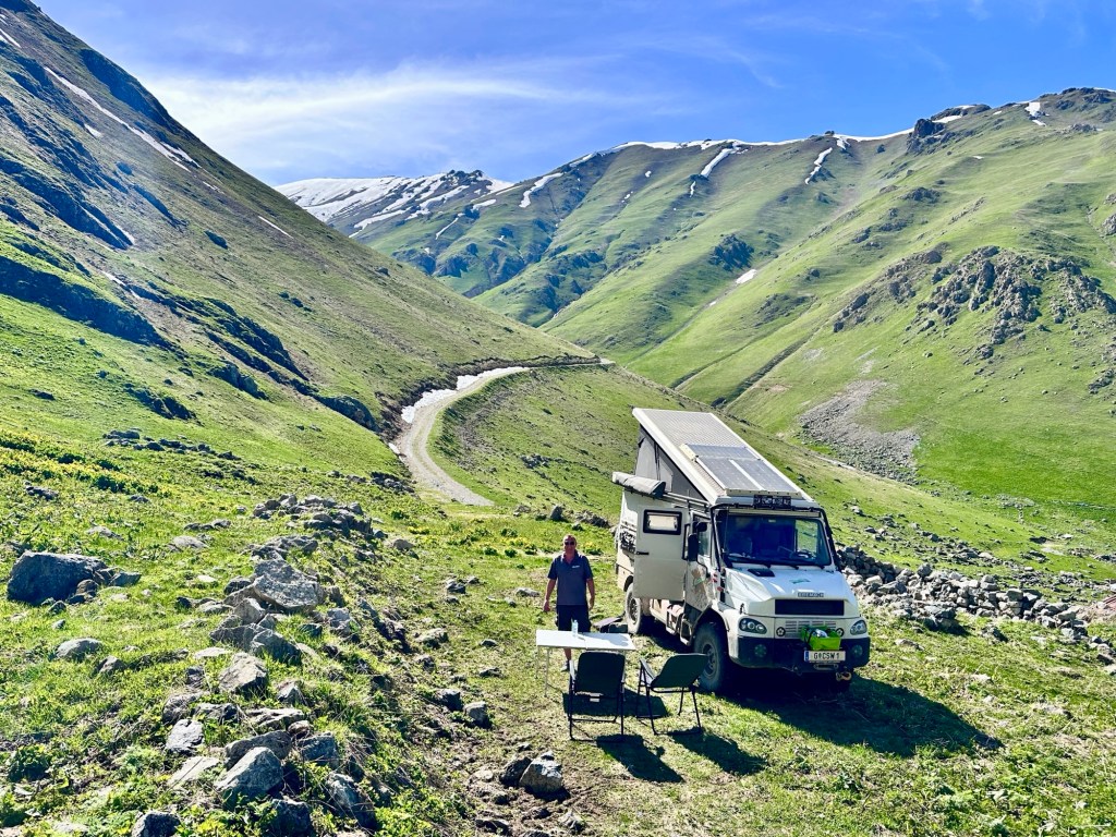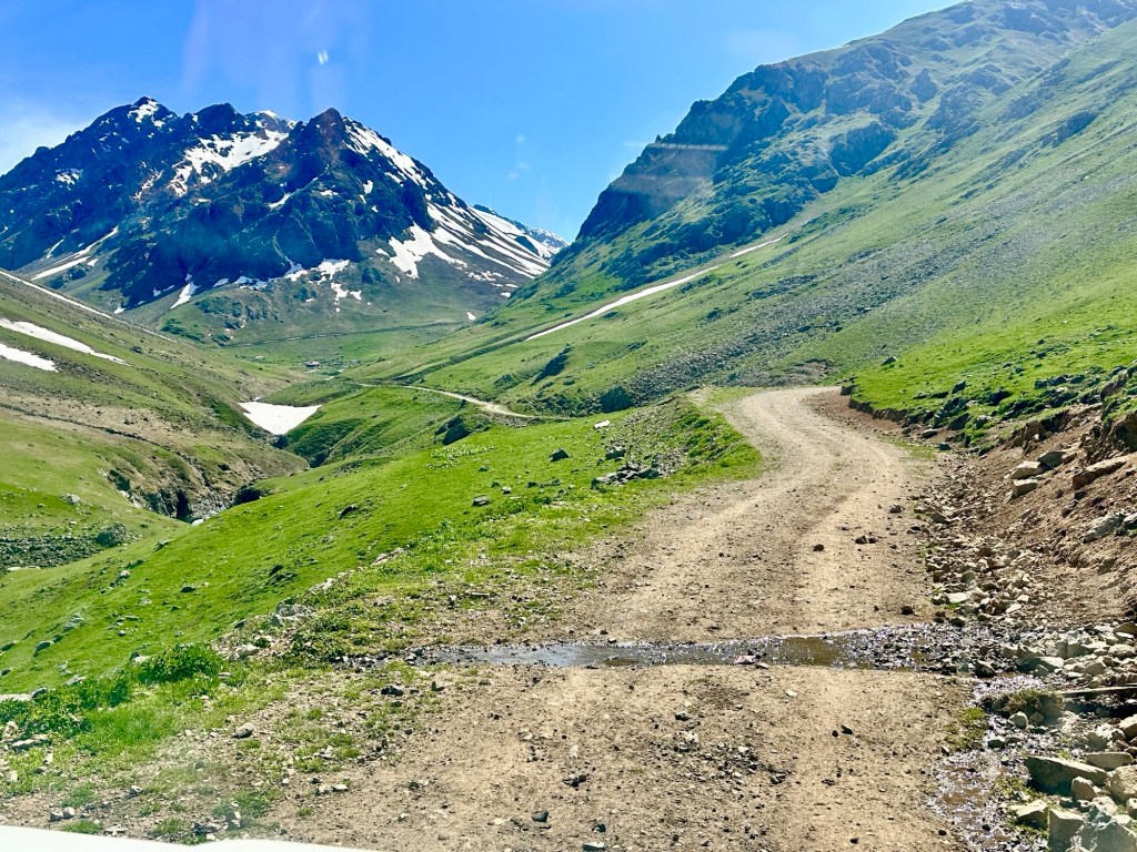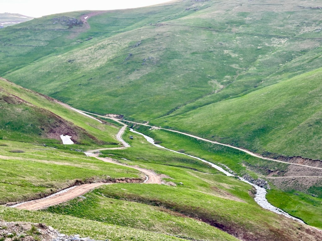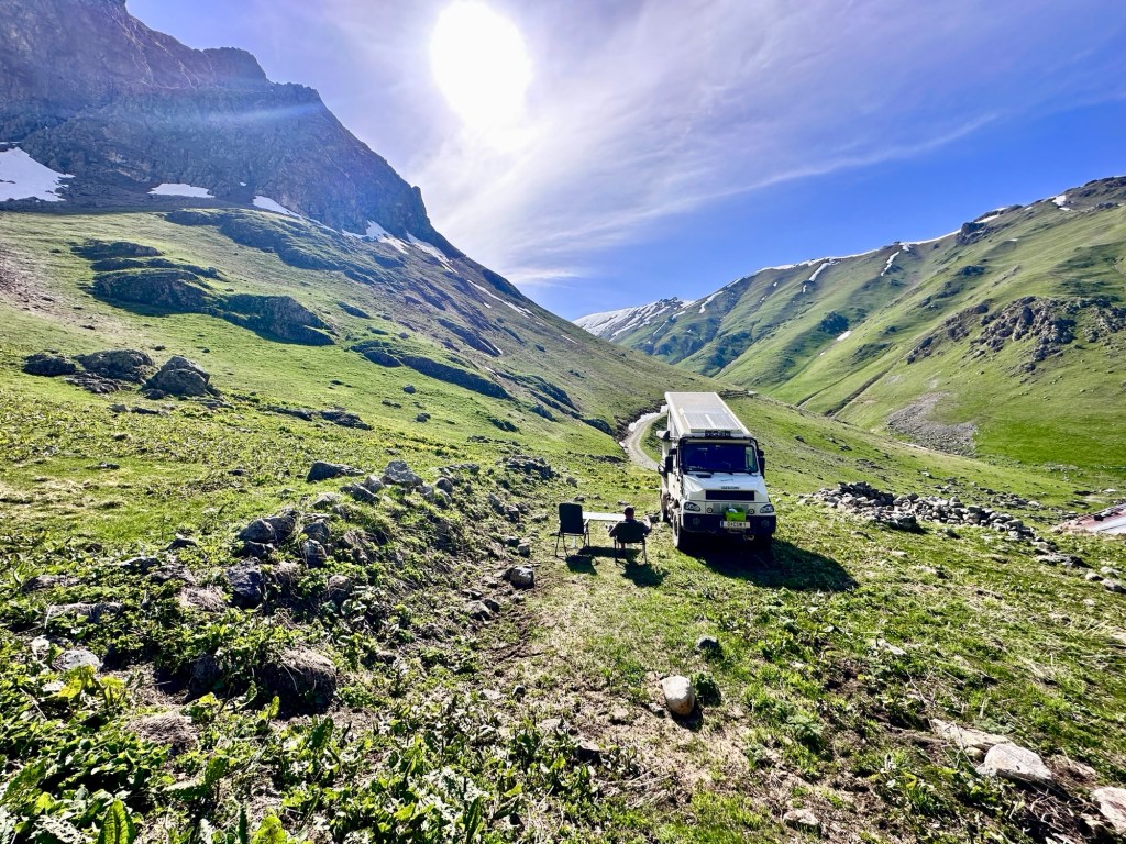 So wird mir jetzt auch mulmig zu mute, wenn ich mir unsere bevorstehende Route auf der Karte anschaue. Wir wollen hinauf auf 2.900 m. Der Weg hat sicher gerade mal Fahrzeugbreite und windet sich in einer Passage in mehreren Spitzkehren über 700 Höhenmeter steil den Berg hinauf, und verläuft dann oben entlang des Grates weiter. Wir haben gesehen, dass die Berge rundum noch ziemlich verschneit sind. Was wenn wir plötzlich irgendwo vor einem Schneefeld oder einem sonstigen Hindernis stehen? Umdrehen kann man gerade auf diesem Abschnitt sicher nirgends. Ich kenne solche Bergwege. Schmal und am Abgrund entlang. Zum Umdrehen mit dem Bremach keine Chance.