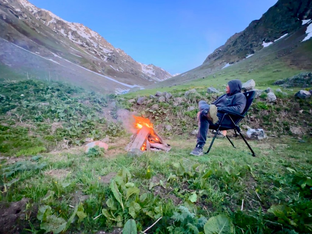 Wir sind nun auf 2.300 m gestrandet. Es war zwar, als die Sonne geschienen hat, recht warm, aber sobald sie weg ist, wird es ganz schön kalt. Wir sammeln etwas Holz zusammen und beginnen schon früh mit dem Lagerfeuer. Ohne Feuer wär es draußen sehr ungemütlich gewesen.