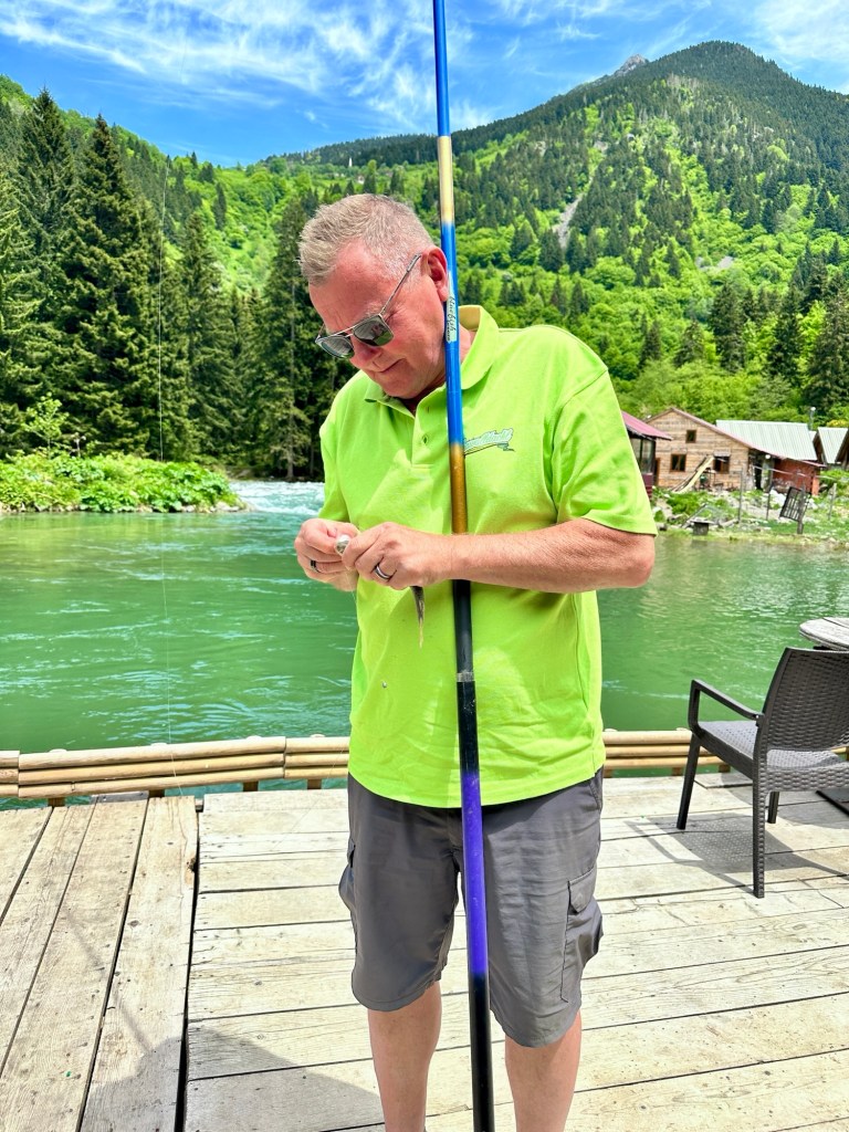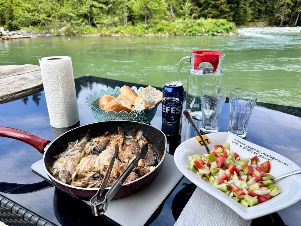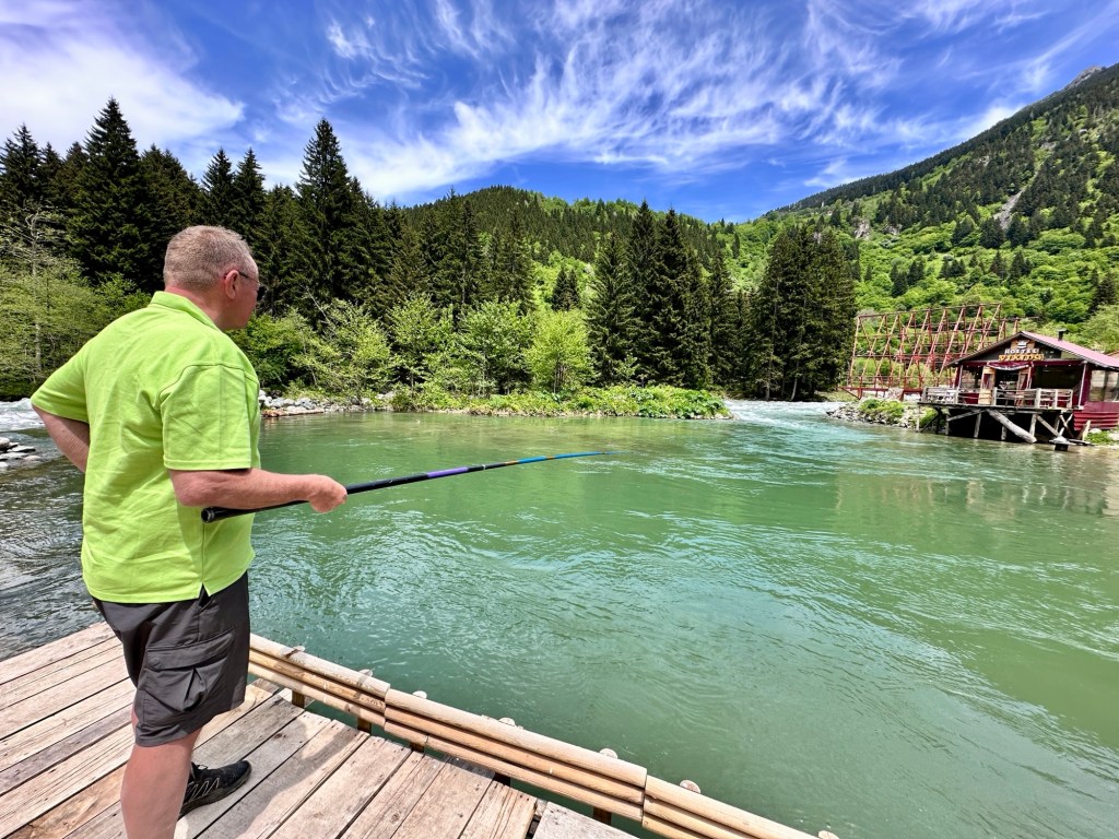 Wir brechen am Vormittag ohne Frühstück von unserem Schlafplatz auf, denn wir haben am Weg eine nette Location gesehen, wo wir jetzt, da wir ja wieder zurück müssen, einkehren wollen. Der Besitzer hat den Fluß etwas umgeleitet, sodass er einen kleinen Teich hat. Als wir hinkommen angelt er gerade. Er drückt Christian die Angel in die Hand, damit er unser Essen zubereiten kann und keine 5 Minuten später hat der Dackl schon den ersten Fang. Eine Regenbogenforelle, die gleich mit in die Pfanne kommt.