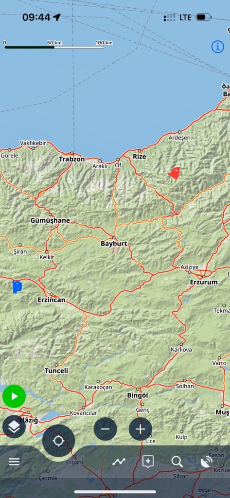 Ich schaue auf der Karte, wie wir denn am besten dorthin kommen. Wir sind irgendwo da, wo ich den roten Punkt auf der Karte eingezeichnet habe und wollen zum blauen Punkt. Für mich also der logische Weg. Das Firtina Deresi Tal nach Ardesen zurück raus (da gibt’s eh keine andere Möglichkeit) und dann von Of über Bayburt und Kelkit Richtung Erzincan. Lauter große Straßen, von Of nach Bayburt geht die D 915, die zwar über den Beggpaß auch in etlichen Kehren verläuft, aber was soll schon sein, bei einer gut ausgebauten Hauptverkehrsroute. So dachte ich zumindest, als ich die Karte studiert hab. Das sollte sich noch als Fehler herausstellen!