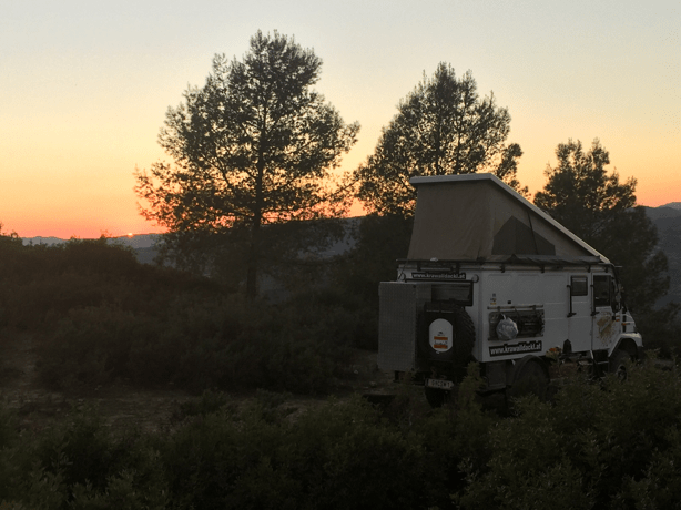 Das wäre ein Ort, an dem des Nächtens viele Jugendliche und Junkies kommen würden, die sehr lästig wären. Wir sollten doch ein Stückchen auf den Berg rauffahren, da sei es schön ruhig. Man kann sich denken, was er meint, liegen doch viele Scherben und Flaschenkapseln herum. Deshalb beherzigen wir seinen Rat und machen und auf die Suche nach einem anderen Schlafplatz. Wie immer gar nicht so einfach, wenn man sich kurz vor Anbruch der Dunkelheit auf die Suche macht. Wir finden nichts optimales, daher stehen wir auf einem kleinen Plateau ein bisschen unterhalb einer Straße (die ich nichtmal in der Karte eingezeichnet hab) etwas abseits der Route, die wir, wenn wir wieder gesund sind, weiterfahren werden. Wird schon passen, für die Nacht, haben wir uns gedacht, noch unwissend, dass das für etwas länger unser Vorgarten sein würde.